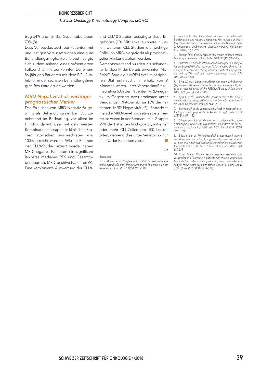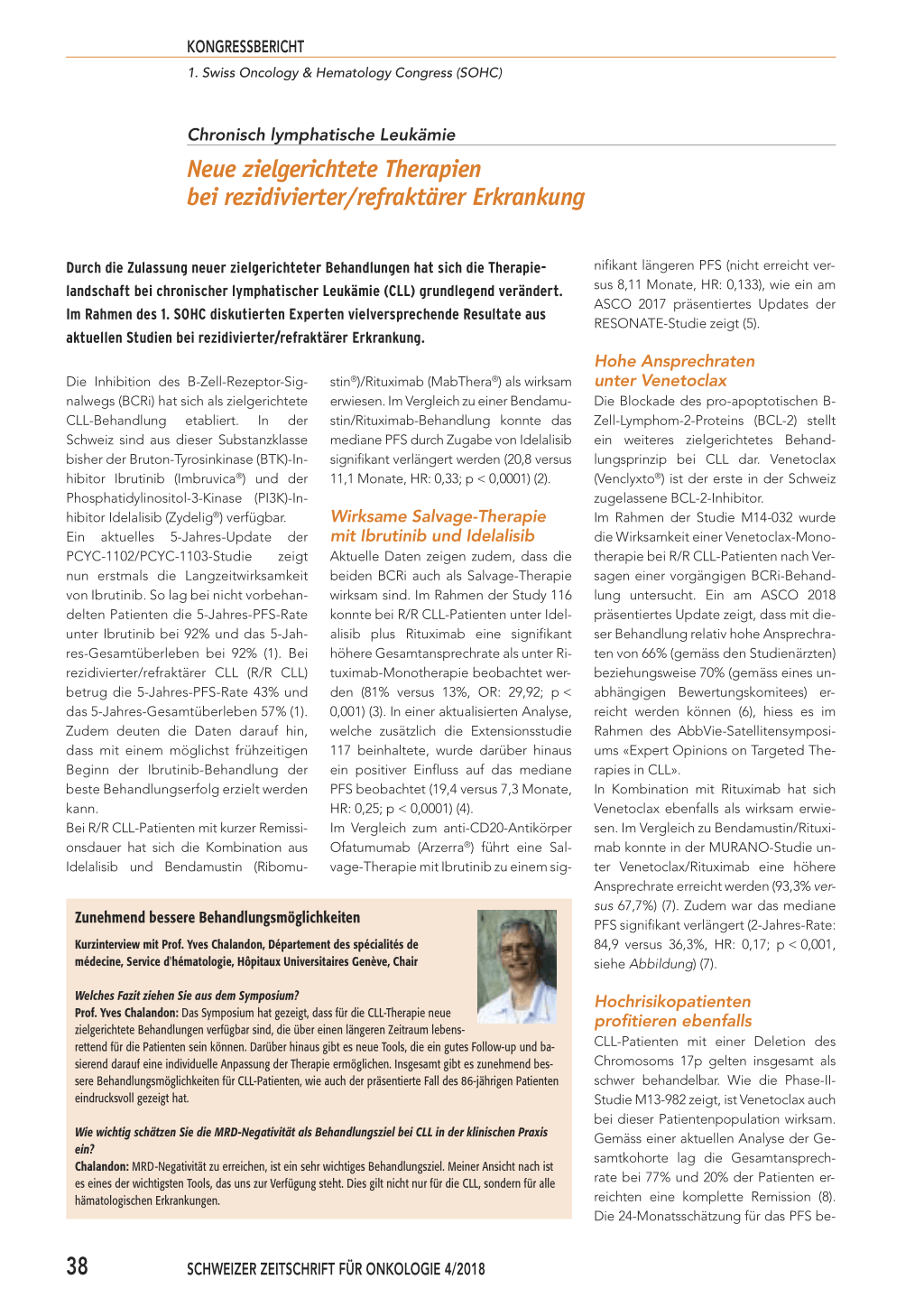 stin®)/Rituximab (MabThera®) als wirksam erwiesen. Im Vergleich zu einer Bendamustin/Rituximab-Behandlung konnte das mediane PFS durch Zugabe von Idelalisib signifikant verlängert werden (20,8 versus 11,1 Monate, HR: 0,33; p < 0,0001) (2). Wirksame Salvage-Therapie mit Ibrutinib und Idelalisib Aktuelle Daten zeigen zudem, dass die beiden BCRi auch als Salvage-Therapie wirksam sind. Im Rahmen der Study 116 konnte bei R/R CLL-Patienten unter Idelalisib plus Rituximab eine signifikant höhere Gesamtansprechrate als unter Rituximab-Monotherapie beobachtet werden (81% versus 13%, OR: 29,92; p < 0,001) (3). In einer aktualisierten Analyse, welche zusätzlich die Extensionsstudie 117 beinhaltete, wurde darüber hinaus ein positiver Einfluss auf das mediane PFS beobachtet (19,4 versus 7,3 Monate, HR: 0,25; p < 0,0001) (4). Im Vergleich zum anti-CD20-Antikörper Ofatumumab (Arzerra®) führt eine Salvage-Therapie mit Ibrutinib zu einem sig- Zunehmend bessere Behandlungsmöglichkeiten Kurzinterview mit Prof. Yves Chalandon, Département des spécialités de médecine, Service d'hématologie, Hôpitaux Universitaires Genève, Chair nifikant längeren PFS (nicht erreicht versus 8,11 Monate, HR: 0,133), wie ein am ASCO 2017 präsentiertes Updates der RESONATE-Studie zeigt (5). Hohe Ansprechraten unter Venetoclax Die Blockade des pro-apoptotischen BZell-Lymphom-2-Proteins (BCL-2) stellt ein weiteres zielgerichtetes Behandlungsprinzip bei CLL dar. Venetoclax (Venclyxto®) ist der erste in der Schweiz zugelassene BCL-2-Inhibitor. Im Rahmen der Studie M14-032 wurde die Wirksamkeit einer Venetoclax-Monotherapie bei R/R CLL-Patienten nach Versagen einer vorgängigen BCRi-Behandlung untersucht. Ein am ASCO 2018 präsentiertes Update zeigt, dass mit dieser Behandlung relativ hohe Ansprechraten von 66% (gemäss den Studienärzten) beziehungsweise 70% (gemäss eines unabhängigen Bewertungskomitees) erreicht werden können (6), hiess es im Rahmen des AbbVie-Satellitensymposiums «Expert Opinions on Targeted Therapies in CLL». In Kombination mit Rituximab hat sich Venetoclax ebenfalls als wirksam erwiesen. Im Vergleich zu Bendamustin/Rituximab konnte in der MURANO-Studie unter Venetoclax/Rituximab eine höhere Ansprechrate erreicht werden (93,3% versus 67,7%) (7). Zudem war das mediane PFS signifikant verlängert (2-Jahres-Rate: 84,9 versus 36,3%, HR: 0,17; p < 0,001, siehe Abbildung) (7). Welches Fazit ziehen Sie aus dem Symposium? Prof. Yves Chalandon: Das Symposium hat gezeigt, dass für die CLL-Therapie neue zielgerichtete Behandlungen verfügbar sind, die über einen längeren Zeitraum lebensrettend für die Patienten sein können. Darüber hinaus gibt es neue Tools, die ein gutes Follow-up und basierend darauf eine individuelle Anpassung der Therapie ermöglichen. Insgesamt gibt es zunehmend bessere Behandlungsmöglichkeiten für CLL-Patienten, wie auch der präsentierte Fall des 86-jährigen Patienten eindrucksvoll gezeigt hat. Wie wichtig schätzen Sie die MRD-Negativität als Behandlungsziel bei CLL in der klinischen Praxis ein? Chalandon: MRD-Negativität zu erreichen, ist ein sehr wichtiges Behandlungsziel. Meiner Ansicht nach ist es eines der wichtigsten Tools, das uns zur Verfügung steht. Dies gilt nicht nur für die CLL, sondern für alle hämatologischen Erkrankungen. Hochrisikopatienten profitieren ebenfalls CLL-Patienten mit einer Deletion des Chromosoms 17p gelten insgesamt als schwer behandelbar. Wie die Phase-IIStudie M13-982 zeigt, ist Venetoclax auch bei dieser Patientenpopulation wirksam. Gemäss einer aktuellen Analyse der Gesamtkohorte lag die Gesamtansprechrate bei 77% und 20% der Patienten erreichten eine komplette Remission (8). Die 24-Monatsschätzung für das PFS be- 38 SCHWEIZER ZEITSCHRIFT FÜR ONKOLOGIE 4/2018 KONGRESSBERICHT 1. Swiss Oncology & Hematology Congress (SOHC) trug 54% und für das Gesamtüberleben 73% (8). Dass Venetoclax auch bei Patienten mit ungünstigen Voraussetzungen eine gute Behandlungsmöglichkeit bietet, zeigte sich zudem anhand eines präsentierten Fallberichts. Hierbei konnten bei einem 86-jährigen Patienten mit dem BCL-2-Inhibitor in der sechsten Behandlungslinie gute Resultate erzielt werden. MRD-Negativität als wichtiger prognostischer Marker Das Erreichen von MRD-Negativität gewinnt als Behandlungsziel bei CLL zunehmend an Bedeutung, vor allem im Hinblick darauf, dass mit den meisten Kombinationstherapien in klinischen Studien inzwischen Ansprechraten von 100% erreicht werden. Wie im Rahmen der CLL8-Studie gezeigt wurde, haben MRD-negative Patienten ein signifikant längeres medianes PFS und Gesamtüberleben als MRD-positive Patienten (9). Eine kombinierte Auswertung der CLL8- und CLL10-Studien bestätigte diese Er- gebnisse (10). Mittlerweile konnte in vie- len weiteren CLL-Studien die wichtige Rolle von MRD-Negativität als prognosti- scher Marker etabliert werden. Dementsprechend wurden als sekundä- rer Endpunkt der bereits erwähnten MU- RANO-Studie die MRD-Level im periphe- ren Blut untersucht. Innerhalb von 9 Monaten waren unter Venetoclax/Rituxi- mab etwa 60% der Patienten MRD-nega- tiv. Im Gegensatz dazu erreichten unter Bendamustin/Rituximab nur 13% der Pa- tienten MRD-Negativität (7). Betrachtet man die MRD-Level noch etwas detaillier- ter, so waren in der Bendamustin-Gruppe 29% der Patienten hoch-positiv, mit einer oder mehr CLL-Zellen pro 100 Leuko- zyten, während dies unter Venetoclax nur auf 5% der Patienten zutraf. I CD Referenzen: 1. O’Brien S et al.: Single-agent ibrutinib in treatment-naïve and relapsed/refractory chronic lymphocytic leukemia: a 5-year experience. Blood 2018; 131(17): 1910–1919. 2. Zelenetz AD et al.: Idelalisib or placebo in combination with bendamustine and rituximab in patients with relapsed or refractory chronic lymphocytic leukaemia: interim results from a phase 3, randomised, double-blind, placebo-controlled trial. Lancet Oncol 2017; 18(3): 297–311. 3. Furman RR et al.: Idelalisib and rituxim