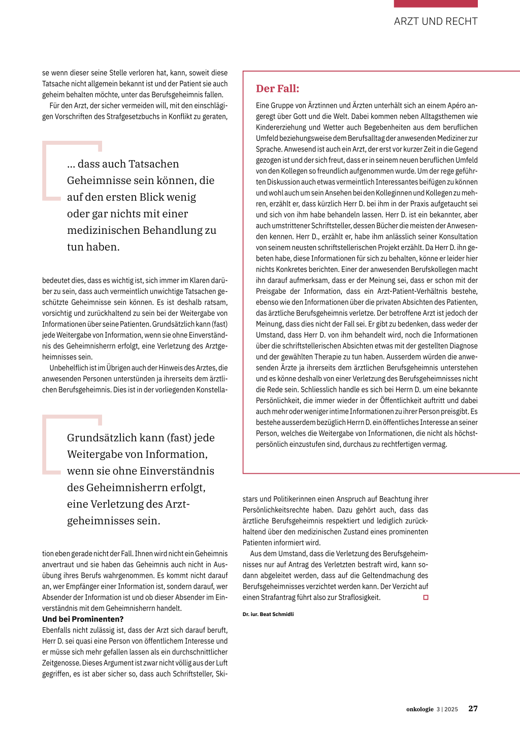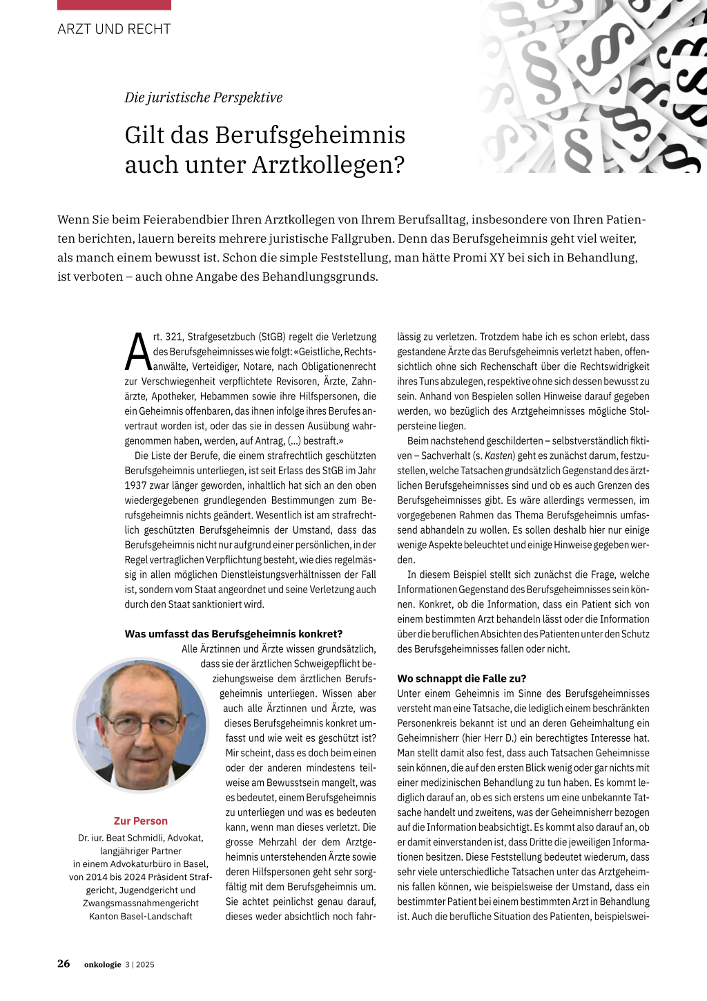 lässig zu verletzen. Trotzdem habe ich es schon erlebt, dass gestandene Ärzte das Berufsgeheimnis verletzt haben, offensichtlich ohne sich Rechenschaft über die Rechtswidrigkeit ihres Tuns abzulegen, respektive ohne sich dessen bewusst zu sein. Anhand von Bespielen sollen Hinweise darauf gegeben werden, wo bezüglich des Arztgeheimnisses mögliche Stolpersteine liegen.