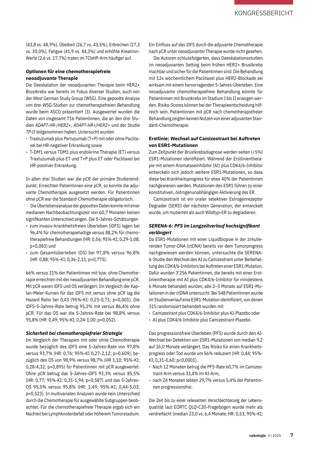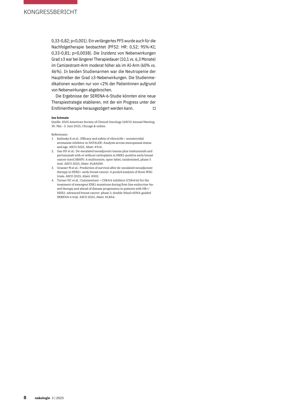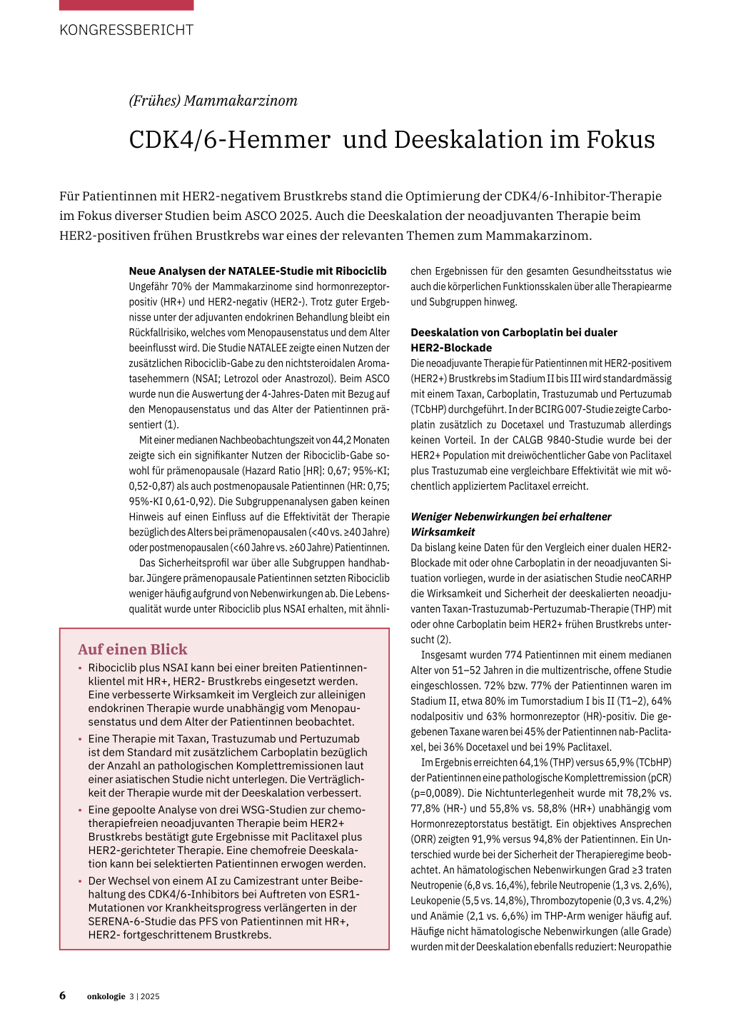 aromatase inhibitor in NATALEE: Analysis across menopausal status and age. ASCO 2025, Abstr. #516. 2. Gao HF et al.: De-escalated neoadjuvant taxane plus trastuzumab and pertuzumab with or without carboplatin in HER2-positive early breast cancer (neoCARHP): A multicentre, open-label, randomised, phase 3 trial. ASCO 2025, Abstr. #LBA500. 3. Graeser M et al.: Prediction of survival after de-escalated neoadjuvant therapy in HER2+ early breast cancer: A pooled analysis of three WSG trials. ASCO 2025, Abstr. #502. 4. Turner NC et al.: Camizestrant + CDK4/6 inhibitor (CDK4/6i) for the treatment of emergent ESR1 mutations during first-line endocrine-based therapy and ahead of disease progression in patients with HR+/ HER2- advanced breast cancer: phase 3, double-blind ctDNA-guided SERENA-6 trial. ASCO 2025, Abstr. #LBA4.
