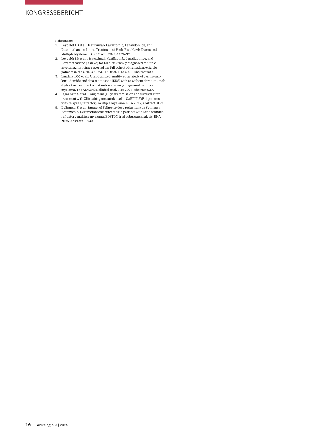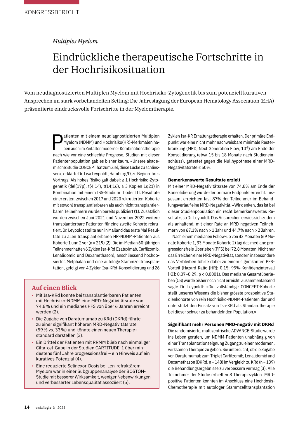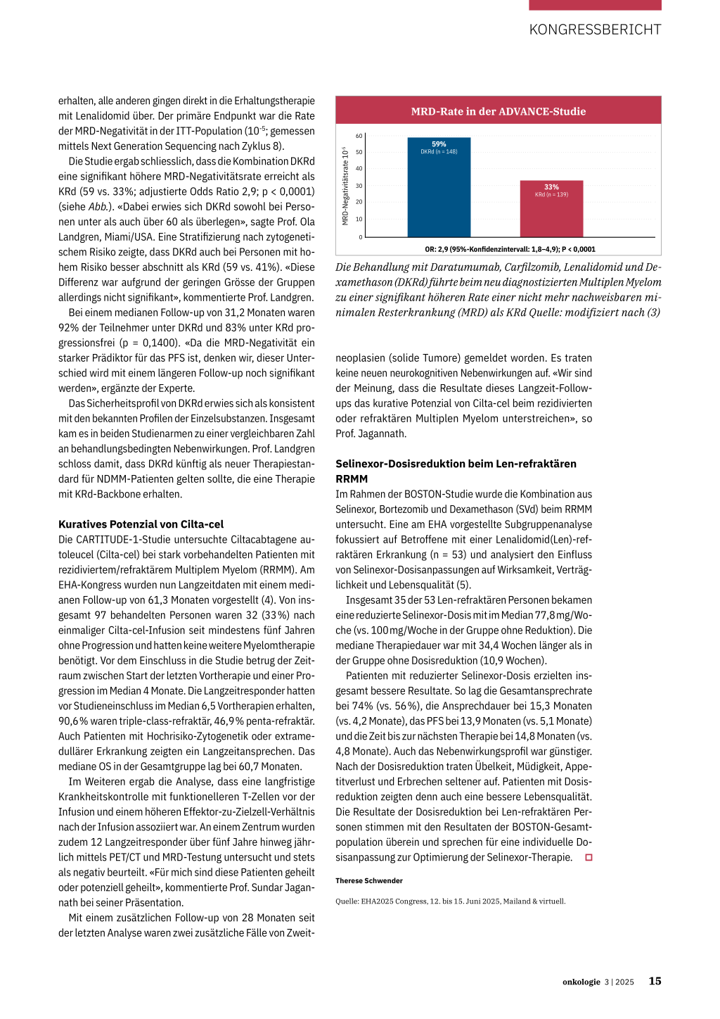 Nach einem medianen Follow-up von 43 Monaten (69 Monate Kohorte 1, 33 Monate Kohorte 2) lag das mediane progressionsfreie Überleben (PFS) bei 72,8 Monaten. Nicht nur das Erreichen einer MRD-Negativität, sondern insbesondere das Verbleiben führte dabei zu einem signifikanten PFSVorteil (Hazard Ratio [HR]: 0,15; 95%-Konfidenzintervall [KI]: 0,07–0,29, p < 0,0001). Das mediane Gesamtüberleben (OS) wurde bisher noch nicht erreicht. Zusammenfassend sagte Dr. Leypoldt: «Die vollständige CONCEPT-Kohorte stellt unseres Wissens die bisher grösste prospektive Studienkohorte von rein Hochrisiko-NDMM-Patienten dar und unterstützt den Einsatz von Isa-KRd als Standardtherapie bei dieser schwer zu behandelnden Population.» Signifikant mehr Personen MRD-negativ mit DKRd Die randomisierte, multizentrische ADVANCE-Studie wurde ins Leben gerufen, um NDMM-Patienten unabhängig von einer Transplantationseignung Zugang zu einer modernen, wirksamen Therapie zu geben. Sie untersucht, ob die Zugabe von Daratumumab zum Triplet Carfilzomib, Lenalidomid und Dexamethason (DKRd, n = 148) im Vergleich zu KRd (n = 139) die Behandlungsergebnisse zu verbessern vermag (3). Alle Teilnehmer der Studie erhielten 8 Therapiezyklen. MRDpositive Patienten konnten im Anschluss eine HochdosisChemotherapie mit autologer Stammzelltransplantation 14 onkologie 3 | 2025 KONGRESSBERICHT erhalten, alle anderen gingen direkt in die Erhaltungstherapie mit Lenalidomid über. Der primäre Endpunkt war die Rate der MRD-Negativität in der ITT-Population (10-5; gemessen mittels Next Generation Sequencing nach Zyklus 8). Die Studie ergab schliesslich, dass die Kombination DKRd eine signifikant höhere MRD-Negativitätsrate erreicht als KRd (59 vs. 33%; adjustierte Odds Ratio 2,9; p < 0,0001) (siehe Abb.). «Dabei erwies sich DKRd sowohl bei Personen unter als auch über 60 als überlegen», sagte Prof. Ola Landgren, Miami/USA. Eine Stratifizierung nach zytogenetischem Risiko zeigte, dass DKRd auch bei Personen mit hohem Risiko besser abschnitt als KRd (59 vs. 41%). «Diese Differenz war aufgrund der geringen Grösse der Gruppen allerdings nicht signifikant», kommentierte Prof. Landgren. Bei einem medianen Follow-up von 31,2 Monaten waren 92% der Teilnehmer unter DKRd und 83% unter KRd progressionsfrei (p = 0,1400). «Da die MRD-Negativität ein starker Prädiktor für das PFS ist, denken wir, dieser Unterschied wird mit einem längeren Follow-up noch signifikant werden», ergänzte der Experte. Das Sicherheitsprofil von DKRd erwies sich als konsistent mit den bekannten Profilen der Einzelsubstanzen. Insgesamt kam es in beiden Studienarmen zu einer vergleichbaren Zahl an behandlungsbedingten Nebenwirkungen. Prof. Landgren schloss damit, dass DKRd künftig als neuer Therapiestandard für NDMM-Patienten gelten sollte, die eine Therapie mit KRd-Backbone erhalten. Kuratives Potenzial von Cilta-cel Die CARTITUDE-1-Studie untersuchte Ciltacabtagene autoleucel (Cilta-cel) bei stark vorbehandelten Patienten mit rezidiviertem/refraktärem Multiplem Myelom (RRMM). Am EHA-Kongress wurden nun Langzeitdaten mit einem medianen Follow-up von 61,3 Monaten vorgestellt (4). Von insgesamt 97 behandelten Personen waren 32 (33 %) nach einmaliger Cilta-cel-Infusion seit mindestens fünf Jahren ohne Progression und hatten keine weitere Myelomtherapie benötigt. Vor dem Einschluss in die Studie betrug der Zeitraum zwischen Start der letzten Vortherapie und einer Progression im Median 4 Monate. Die Langzeitresponder hatten vor Studieneinschluss im Median 6,5 Vortherapien erhalten, 90,6 % waren triple-class-refraktär, 46,9 % penta-refraktär. Auch Patienten mit Hochrisiko-Zytogenetik oder extramedullärer Erkrankung zeigten ein Langzeitansprechen. Das mediane OS in der Gesamtgruppe lag bei 60,7 Monaten. Im Weiteren ergab die Analyse, dass eine langfristige Krankheitskontrolle mit funktionelleren T-Zellen vor der ­Infusion und einem höheren Effektor-zu-Zielzell-Verhältnis nach der Infusion assoziiert war. An einem Zentrum wurden zudem 12 Langzeitresponder über fünf Jahre hinweg jährlich mittels PET/CT und MRD-Testung untersucht und stets als negativ beurteilt. «Für mich sind diese Patienten geheilt oder potenziell geheilt», kommentierte Prof. Sundar Jagannath bei seiner Präsentation. Mit einem zusätzlichen Follow-up von 28 Monaten seit der letzten Analyse waren zwei zusätzliche Fälle von Zweit- MRD-Negativitätsrate 10-5 MRD-Rate in der ADVANCE-Studie 60 59% 50 DKRd (n = 148) 40 30 33% KRd (n = 139) 20 10 0 OR: 2,9 (95%-Konfidenzintervall: 1,8–4,9); P < 0,0001 Die Behandlung mit Daratumumab, Carfilzomib, Lenalidomid und Dexamethason (DKRd) führte beim neu diagnostizierten Multiplen Myelom zu einer signifikant höheren Rate einer nicht mehr nachweisbaren minimalen Resterkrankung (MRD) als KRd Quelle: modifiziert nach (3) neoplasien (solide Tumore) gemeldet worden. Es traten keine neuen neurokognitiven Nebenwirkungen auf. «Wir sind der Meinung, dass die Resultate dieses Langzeit-Followups das kurative Potenzial von Cilta-cel beim rezidivierten oder refraktären Multiplen Myelom unterstreichen», so Prof. Jagannath. Selinexor-Dosisreduktion beim Len-refraktären RRMM Im Rahmen der BOSTON-Studie wurde die Kombination aus Selinexor, Bortezomib und Dexamethason (SVd) beim RRMM untersucht. Eine am EHA vorgestellte Subgruppenanalyse fokussiert auf Betroffene mit einer Lenalidomid(Len)-refraktären Erkrankung (n = 53) und analysiert den Einfluss von Selinexor-Dosisanpassungen auf Wirksamkeit, Verträglichkeit und Lebensqualität (5). Insgesamt 35 der 53 Len-refraktären Personen bekamen eine reduzierte Selinexor-Dosis mit im Median 77,8 mg/Woche (vs. 100 mg/Woche in der Gruppe ohne Reduktion). Die mediane Therapiedauer war mit 34,4 Wochen länger als in der Gruppe ohne Dosisreduktion (10,9 Wochen). Patienten mit reduzierter Selinexor-Dosis erzielten insgesamt bessere Resultate. So lag die Gesamtansprechrate bei 74% (vs. 56 %), die Anspre