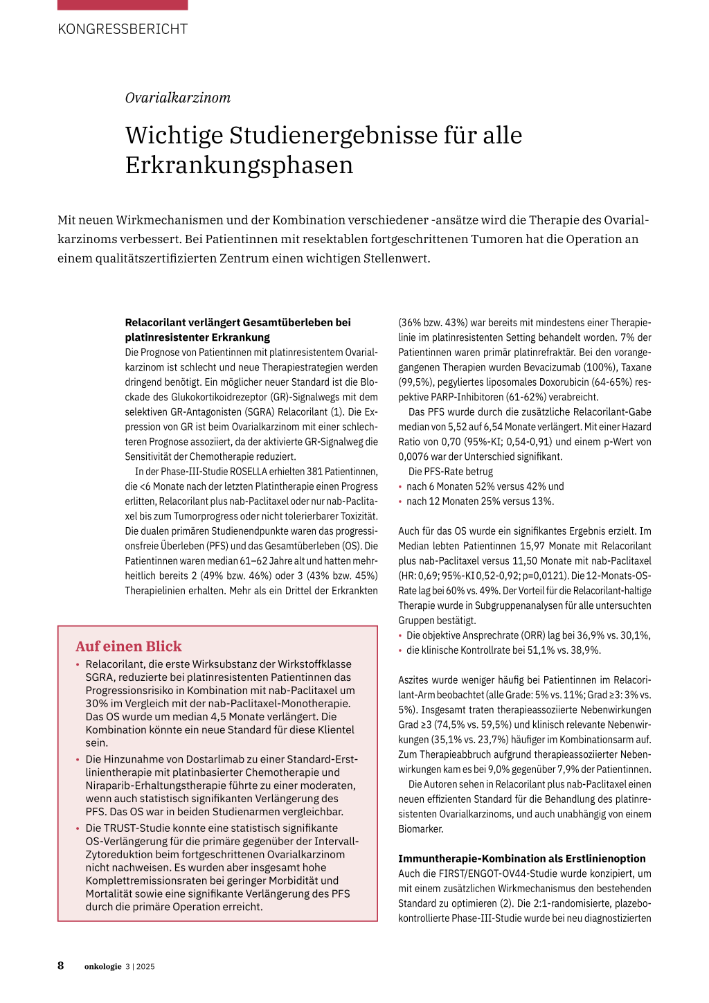 Relacorilant verlängert Gesamtüberleben bei platinresistenter Erkrankung Die Prognose von Patientinnen mit platinresistentem Ovarialkarzinom ist schlecht und neue Therapiestrategien werden dringend benötigt. Ein möglicher neuer Standard ist die Blockade des Glukokortikoidrezeptor (GR)-Signalwegs mit dem selektiven GR-Antagonisten (SGRA) Relacorilant (1). Die Expression von GR ist beim Ovarialkarzinom mit einer schlechteren Prognose assoziiert, da der aktivierte GR-Signalweg die Sensitivität der Chemotherapie reduziert.