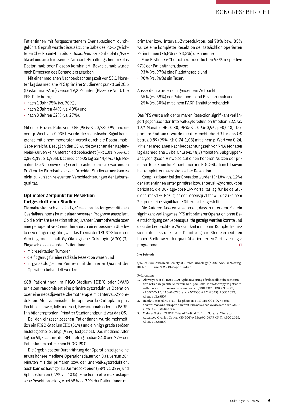 tion with nab-paclitaxel versus nab-paclitaxel monotherapy in patients with platinum-resistant ovarian cancer (GOG-3073, ENGOT-ov72, APGOT-Ov10, LACoG-0223, and ANZGOG-2221/2023). ASCO 2025, Abstr. #LBA5507. 2. Hardy-Bessard AC et al: The phase III FIRST/ENGOT-OV44 trial: dostarlimab and niraparib in first-line advanced ovarian cancer. ASCO 2025, Abstr. #LBA5506. 3. Mahner S et al: TRUST: Trial of Radical Upfront Surgical Therapy in Advanced Ovarian Cancer (ENGOT ov33/AGO-OVAR OP.7). ASCO 2025, Abstr. #LBA5500.