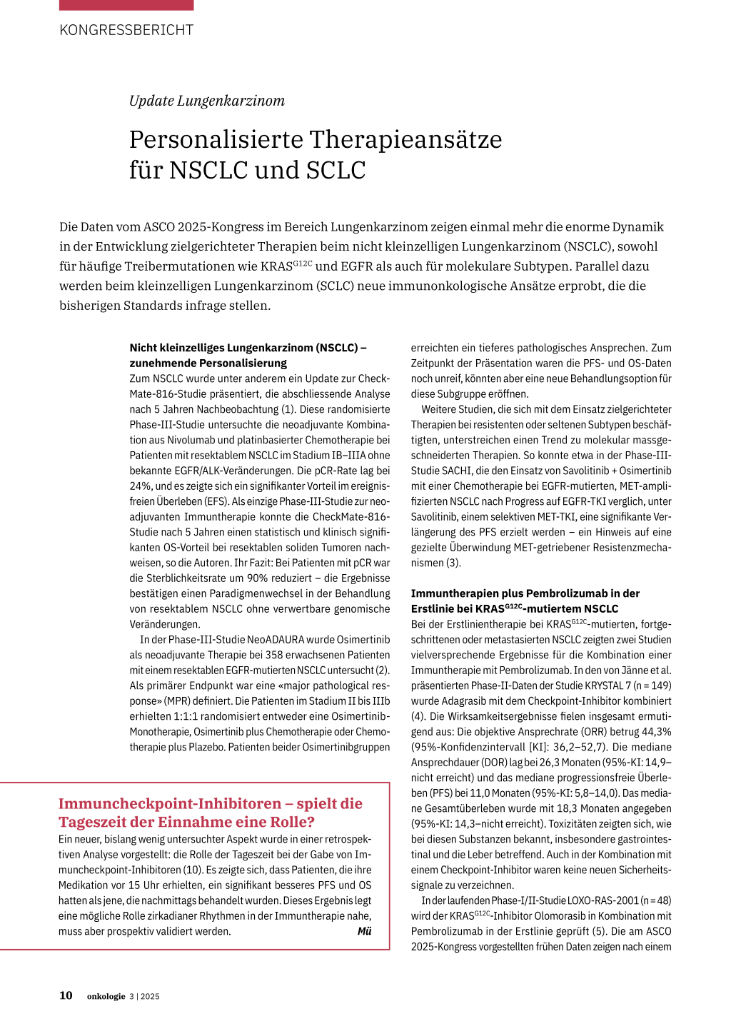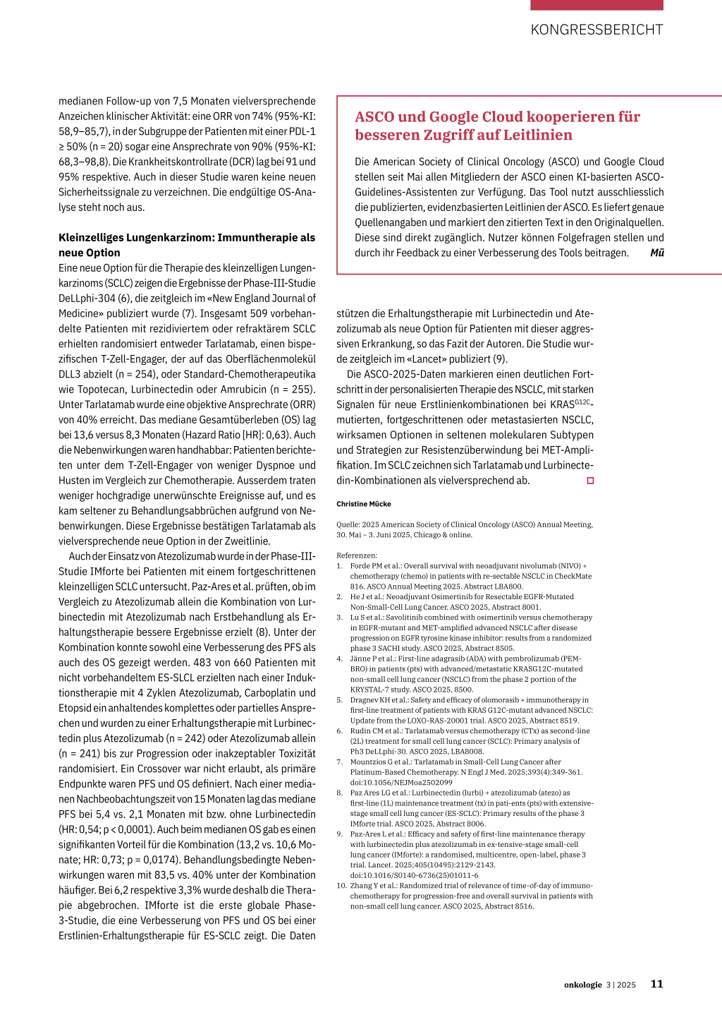 Auch der Einsatz von Atezolizumab wurde in der Phase-IIIStudie IMforte bei Patienten mit einem fortgeschrittenen kleinzelligen SCLC untersucht. Paz-Ares et al. prüften, ob im Vergleich zu Atezolizumab allein die Kombination von Lur­ binectedin mit Atezolizumab nach Erstbehandlung als Er­ haltungstherapie bessere Ergebnisse erzielt (8). Unter der Kombination konnte sowohl eine Verbesserung des PFS als auch des OS gezeigt werden. 483 von 660 Patienten mit nicht vorbehandeltem ES-SLCL erzielten nach einer Induk­ tionstherapie mit 4 Zyklen Atezolizumab, Carboplatin und Etopsid ein anhaltendes komplettes oder partielles Anspre­ chen und wurden zu einer Erhaltungstherapie mit Lurbinec­ tedin plus Atezolizumab (n = 242) oder Atezolizumab allein (n = 241) bis zur Progression oder inakzeptabler Toxizität randomisiert. Ein Crossover war nicht erlaubt, als primäre Endpunkte waren PFS und OS definiert. Nach einer media­ nen Nachbeobachtungszeit von 15 Monaten lag das mediane PFS bei 5,4 vs. 2,1 Monaten mit bzw. ohne Lurbinectedin (HR: 0,54; p < 0,0001). Auch beim medianen OS gab es einen signifikanten Vorteil für die Kombination (13,2 vs. 10,6 Mo­ nate; HR: 0,73; p = 0,0174). Behandlungsbedingte Neben­ wirkungen waren mit 83,5 vs. 40% unter der Kombination häufiger. Bei 6,2 respektive 3,3% wurde deshalb die Thera­ pie abgebrochen. IMforte ist die erste globale Phase3-Studie, die eine Verbesserung von PFS und OS bei einer Erstlinien-Erhaltungstherapie für ES-SCLC zeigt. Die Daten ASCO und Google Cloud kooperieren für besseren Zugriff auf Leitlinien Die American Society of Clinical Oncology (ASCO) und Google Cloud stellen seit Mai allen Mitgliedern der ASCO einen KI-basierten ASCOGuidelines-Assistenten zur Verfügung. Das Tool nutzt ausschliesslich die publizierten, evidenzbasierten Leitlinien der ASCO. Es liefert genaue Quellenangaben und markiert den zitierten Text in den Originalquellen. Diese sind direkt zugänglich. Nutzer können Folgefragen stellen und durch ihr Feedback zu einer Verbesserung des Tools beitragen.  Mü stützen die Erhaltungstherapie mit Lurbinectedin und Ate­ zolizumab als neue Option für Patienten mit dieser aggres­ siven Erkrankung, so das Fazit der Autoren. Die Studie wur­ de zeitgleich im «Lancet» publiziert (9). Die ASCO-2025-Daten markieren einen deutlichen Fort­ schritt in der personalisierten Therapie des NSCLC, mit starken Signalen für neue Erstlinienkombinationen bei KRASG12Cmutierten, fortgeschrittenen oder metastasierten NSCLC, wirksamen Optionen in seltenen molekularen Subtypen und Strategien zur Resistenzüberwindung bei MET-Ampli­ fikation. Im SCLC zeichnen sich Tarlatamab und Lurbinecte­ din-Kombinationen als vielversprechend ab.  Christine Mücke Quelle: 2025 American Society of Clinical Oncology (ASCO) Annual Meeting, 30. Mai – 3. Juni 2025, Chicago & online. Referenzen: 1. Forde PM et al.: Overall survival with neoadjuvant nivolumab (NIVO) + chemotherapy (chemo) in patients with re-sectable NSCLC in CheckMate 816. ASCO Annual Meeting 2025. Abstract LBA800. 2. He J et al.: Neoadjuvant Osimertinib for Resectable EGFR-Mutated Non-Small-Cell Lung Cancer. ASCO 2025, Abstract 8001. 3. Lu S et al.: Savolitinib combined with osimertinib versus chemotherapy in EGFR-mutant and MET-amplified advanced NSCLC after disease progression on EGFR tyrosine kinase inhibitor: results from a randomized phase 3 SACHI study. ASCO 2025, Abstract 8505. 4. Jänne P et al.: First-line adagrasib (ADA) with pembrolizumab (PEMBRO) in patients (pts) with advanced/metastatic KRASG12C-mutated non-small cell lung cancer (NSCLC) from the phase 2 portion of the KRYSTAL-7 study. ASCO 2025, 8500. 5. Dragnev KH et al.: Safety and efficacy of olomorasib + immunotherapy in first-line treatment of patients with KRAS G12C-mutant advanced NSCLC: Update from the LOXO-RAS-20001 trial. ASCO 2025, Abstract 8519. 6. Rudin CM et al.: Tarlatamab versus chemotherapy (CTx) as second-line (2L) treatment for small cell lung cancer (SCLC): Primary analysis of Ph3 DeLLphi-30. ASCO 2025, LBA8008. 7. Mountzios G et al.: Tarlatamab in Small-Cell Lung Cancer after Platinum-Based Chemotherapy. N Engl J Med. 2025;393(4):349-361. doi:10.1056/NEJMoa2502099 8. Paz Ares LG et al.: Lurbinectedin (lurbi) + atezolizumab (atezo) as first-line (1L) maintenance treatment (tx) in pati-ents (pts) with extensivestage small cell lung cancer (ES-SCLC): Primary results of the phase 3 IMforte trial. ASCO 2025, Abstract 8006. 9. Paz-Ares L et al.: Efficacy and safety of first-line maintenance therapy with lurbinectedin plus atezolizumab in ex-tensive-stage small-cell lung cancer (IMforte): a randomised, multicentre, open-label, phase 3 trial. Lancet. 2025;405(10495):2129-2143. doi:10.1016/S0140-6736(25)01011-6 10. Zhang Y et al.: Randomized trial of relevance of time-of-day of immunochemotherapy for progression-free and overall survival in patients with non-small cell lung cancer. ASCO 2025, Abstract 8516. onkologie 3 | 2025 11