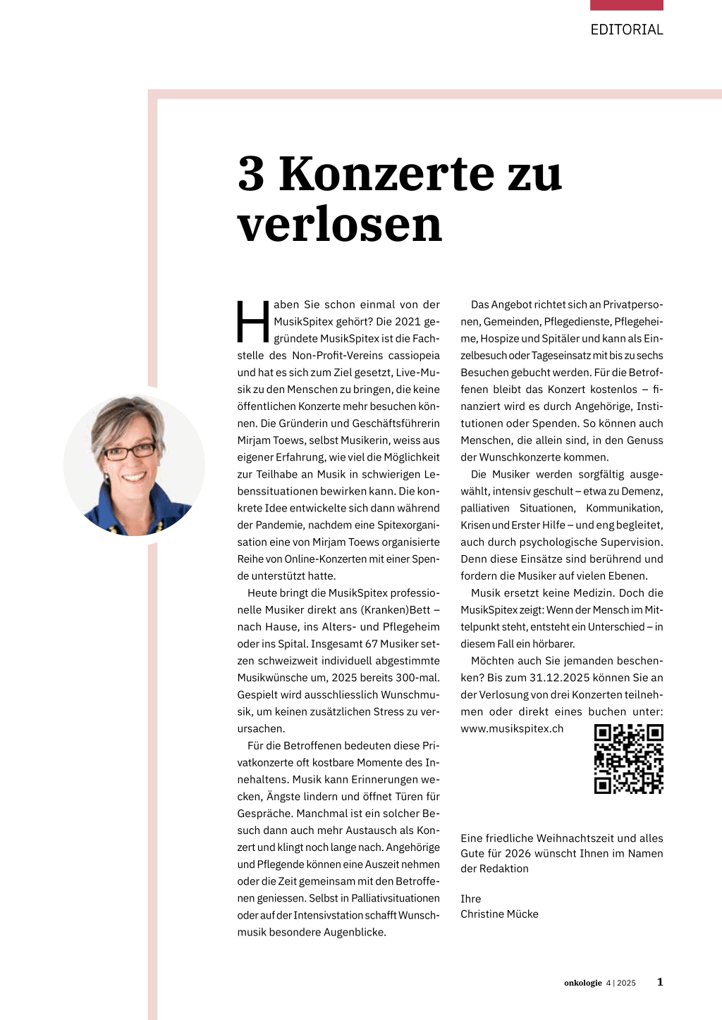 Möchten auch Sie jemanden beschenken? Bis zum 31.12.2025 können Sie an der Verlosung von drei Konzerten teilnehmen oder direkt eines buchen unter: www.musikspitex.ch