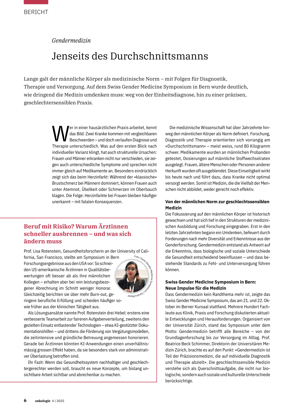 Swiss Gender Medicine Symposium in Bern: Neue Impulse für die Medizin Dass Gendermedizin kein Randthema mehr ist, zeigte das Swiss Gender Medicine Symposium, das am 21. und 22. Oktober im Berner Kursaal stattfand. Mehrere Hundert Fachleute aus Klinik, Praxis und Forschung diskutierten aktuelle Entwicklungen und Herausforderungen. Organisiert von der Universität Zürich, stand das Symposium unter dem Motto: Gendermedizin betrifft alle Bereiche – von der Grundlagenforschung bis zur Versorgung im Alltag. Prof. Beatrice Beck Schimmer, Direktorin der Universitären Medizin Zürich, brachte es auf den Punkt: «Gendermedizin ist Teil der Präzisionsmedizin, die auf individuelle Diagnostik und Therapie abzielt». Die geschlechtssensible Medizin verstehe sich als Querschnittsaufgabe, die nicht nur biologische, sondern auch soziale und kulturelle Unterschiede berücksichtige.