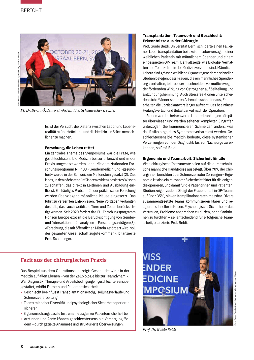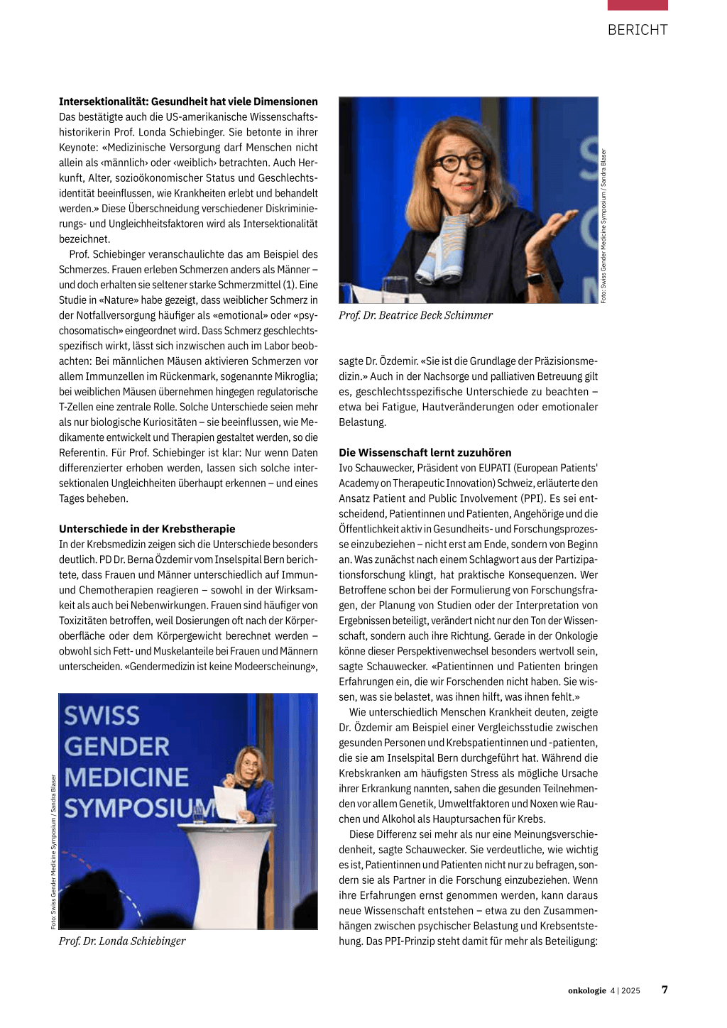 sagte Dr. Özdemir. «Sie ist die Grundlage der Präzisionsmedizin.» Auch in der Nachsorge und palliativen Betreuung gilt es, geschlechtsspezifische Unterschiede zu beachten – etwa bei Fatigue, Hautveränderungen oder emotionaler Belastung.