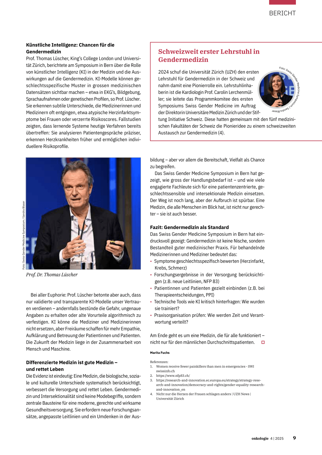 Forschung, die Leben rettet Ein zentrales Thema des Symposiums war die Frage, wie geschlechtssensible Medizin besser erforscht und in der Praxis umgesetzt werden kann. Mit dem Nationalen Forschungsprogramm NFP 83 «Gendermedizin und -gesundheit» wurde in der Schweiz ein Meilenstein gesetzt (2). Ziel ist es, in den nächsten fünf Jahren evidenzbasiertes Wissen zu schaffen, das direkt in Leitlinien und Ausbildung einfliesst. Ein häufiges Problem: In der präklinischen Forschung werden überwiegend männliche Mäuse eingesetzt. Das führt zu verzerrten Ergebnissen. Neue Vorgaben verlangen deshalb, dass auch weibliche Tiere und Zellen berücksichtigt werden. Seit 2020 fordert das EU-Forschungsprogramm Horizon Europe explizit die Berücksichtigung von Genderund Intersektionalitätsanalysen in Forschungsanträgen (3). «Forschung, die mit öffentlichen Mitteln gefördert wird, soll der gesamten Gesellschaft zugutekommen», bilanzierte Prof. Schiebinger.