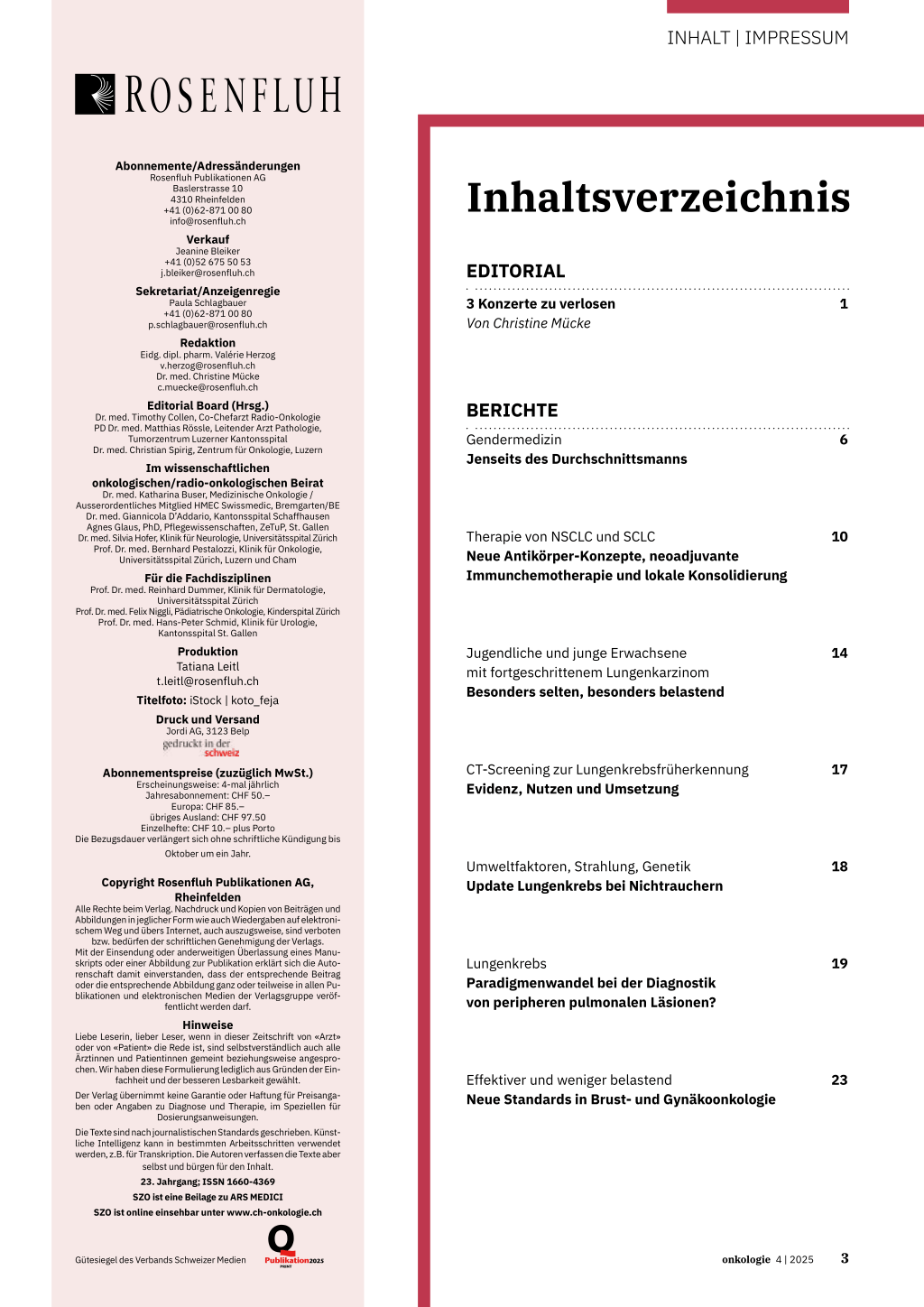 Einzelhefte: CHF 10.– plus Porto Die Bezugsdauer verlängert sich ohne schriftliche Kündigung bis
