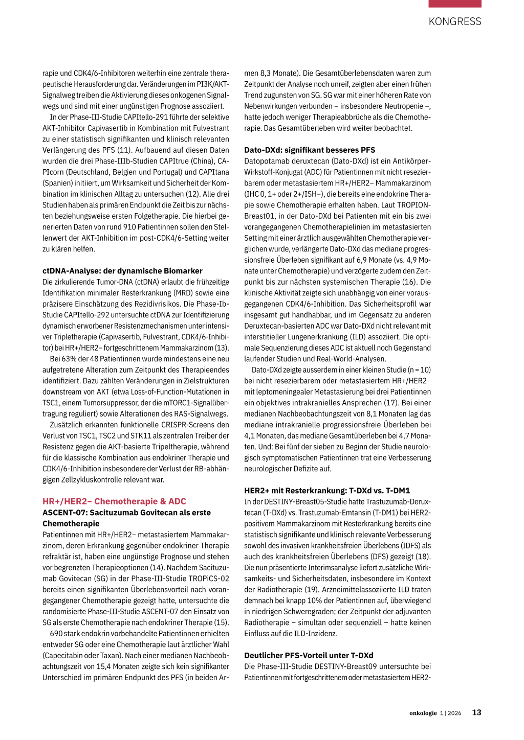Dato-DXd: signifikant besseres PFS Datopotamab deruxtecan (Dato-DXd) ist ein AntikörperWirkstoff-Konjugat (ADC) für Patientinnen mit nicht resezierbarem oder metastasiertem HR+/HER2− Mammakarzinom (IHC 0, 1+ oder 2+/ISH−), die bereits eine endokrine Therapie sowie Chemotherapie erhalten haben. Laut TROPIONBreast01, in der Dato-DXd bei Patienten mit ein bis zwei vorangegangenen Chemotherapielinien im metastasierten Setting mit einer ärztlich ausgewählten Chemotherapie verglichen wurde, verlängerte Dato-DXd das mediane progressionsfreie Überleben signifikant auf 6,9 Monate (vs. 4,9 Monate unter Chemotherapie) und verzögerte zudem den Zeitpunkt bis zur nächsten systemischen Therapie (16). Die klinische Aktivität zeigte sich unabhängig von einer vorausgegangenen CDK4/6-Inhibition. Das Sicherheitsprofil war insgesamt gut handhabbar, und im Gegensatz zu anderen Deruxtecan-basierten ADC war Dato-DXd nicht relevant mit interstitieller Lungenerkrankung (ILD) assoziiert. Die optimale Sequenzierung dieses ADC ist aktuell noch Gegenstand laufender Studien und Real-World-Analysen.