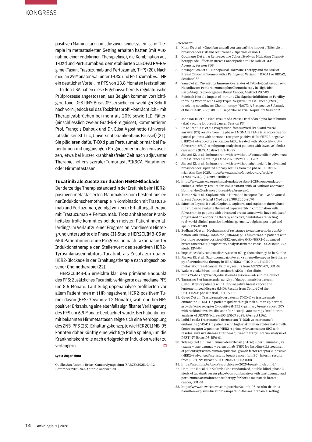 In den USA haben diese Ergebnisse bereits regulatorische Prüfprozesse angestossen, aus Belgien kommen vorsichtigere Töne: DESTINY-Breast09 sei sicher ein wichtiger Schritt nach vorn, jedoch sei das Toxizitätsprofil «beträchtlich», mit Therapieabbrüchen bei mehr als 20% sowie ILD-Fällen (einschliesslich zweier Grad-5-Ereignisse), kommentieren Prof. François Duhoux und Dr. Elisa Agostinetto (Universitätskliniken St. Luc, Universitätskrankenhaus Brüssel) (21). Sie plädieren dafür, T-DXd plus Pertuzumab primär bei Patientinnen mit ungünstigen Prognosemerkmalen einzusetzen, etwa bei kurzer krankheitsfreier Zeit nach adjuvanter Therapie, hoher viszeraler Tumorlast, PIK3CA-Mutationen oder Hirnmetastasen.