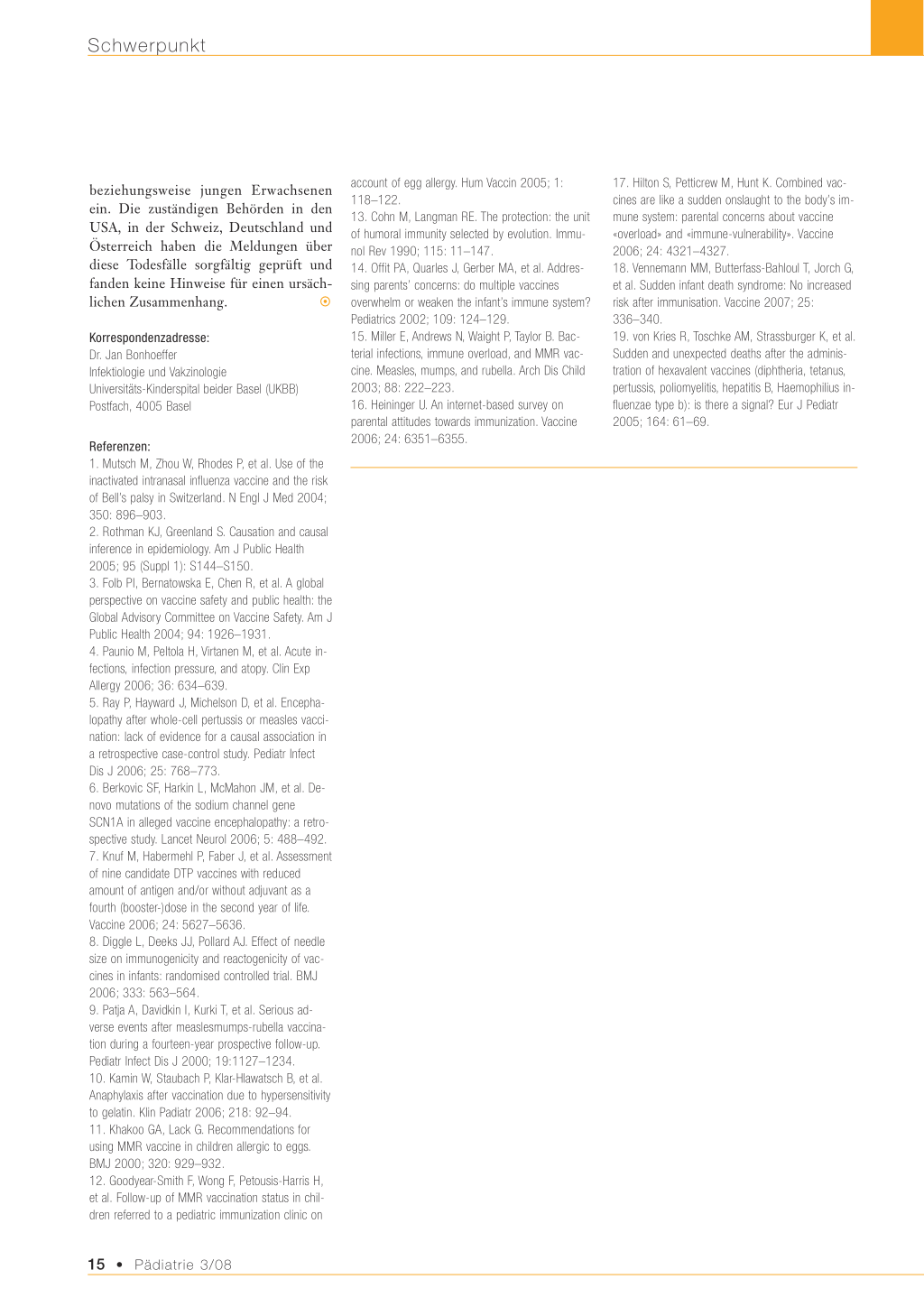 Referenzen: 1. Mutsch M, Zhou W, Rhodes P, et al. Use of the inactivated intranasal influenza vaccine and the risk of Bell’s palsy in Switzerland. N Engl J Med 2004; 350: 896–903. 2. Rothman KJ, Greenland S. Causation and causal inference in epidemiology. Am J Public Health 2005; 95 (Suppl 1): S144–S150. 3. Folb PI, Bernatowska E, Chen R, et al. A global perspective on vaccine safety and public health: the Global Advisory Committee on Vaccine Safety. Am J Public Health 2004; 94: 1926–1931. 4. Paunio M, Peltola H, Virtanen M, et al. Acute infections, infection pressure, and atopy. Clin Exp Allergy 2006; 36: 634–639. 5. Ray P, Hayward J, Michelson D, et al. Encephalopathy after whole-cell pertussis or measles vaccination: lack of evidence for a causal association in a retrospective case-control study. Pediatr Infect Dis J 2006; 25: 768–773. 6. Berkovic SF, Harkin L, McMahon JM, et al. Denovo mutations of the sodium channel gene SCN1A in alleged vaccine encephalopathy: a retrospective study. Lancet Neurol 2006; 5: 488–492. 7. Knuf M, Habermehl P, Faber J, et al. Assessment of nine candidate DTP vaccines with reduced amount of antigen and/or without adjuvant as a fourth (booster-)dose in the second year of life. Vaccine 2006; 24: 5627–5636. 8. Diggle L, Deeks JJ, Pollard AJ. Effect of needle size on immunogenicity and reactogenicity of vaccines in infants: randomised controlled trial. BMJ 2006; 333: 563–564. 9. Patja A, Davidkin I, Kurki T, et al. Serious adverse events after measlesmumps-rubella vaccination during a fourteen-year prospective follow-up. Pediatr Infect Dis J 2000; 19:1127–1234. 10. Kamin W, Staubach P, Klar-Hlawatsch B, et al. Anaphylaxis after vaccination due to hypersensitivity to gelatin. Klin Padiatr 2006; 218: 92–94. 11. Khakoo GA, Lack G. Recommendations for using MMR vaccine in children allergic to eggs. BMJ 2000; 320: 929–932. 12. Goodyear-Smith F, Wong F, Petousis-Harris H, et al. Follow-up of MMR vaccination status in children referred to a pediatric immunization clinic on