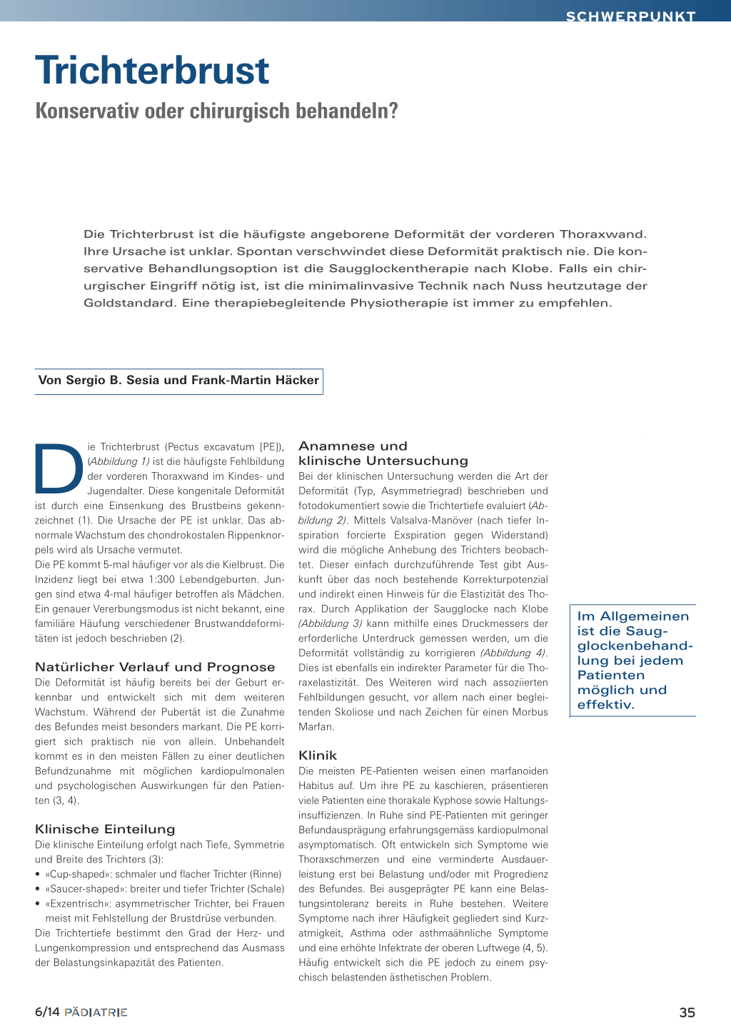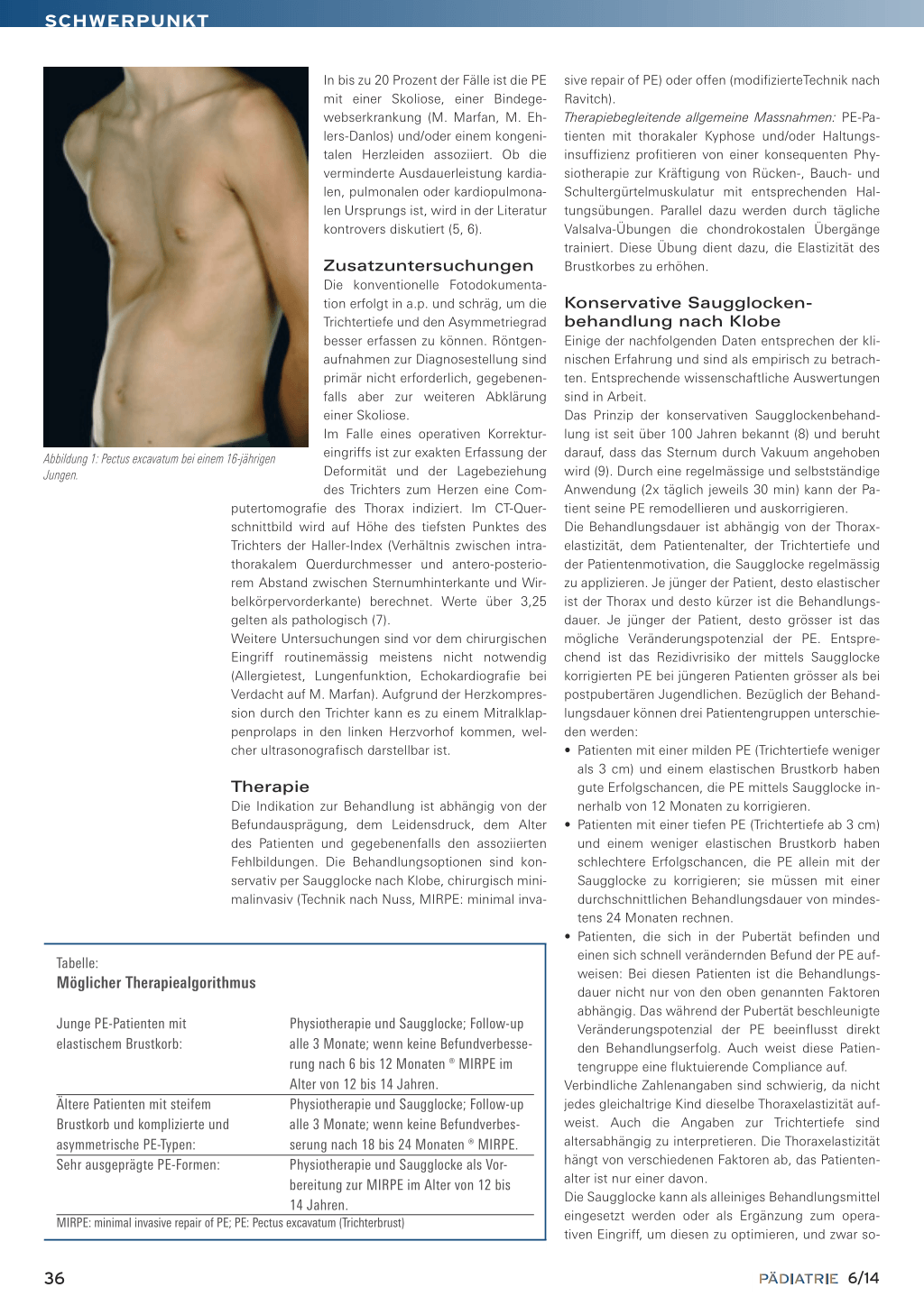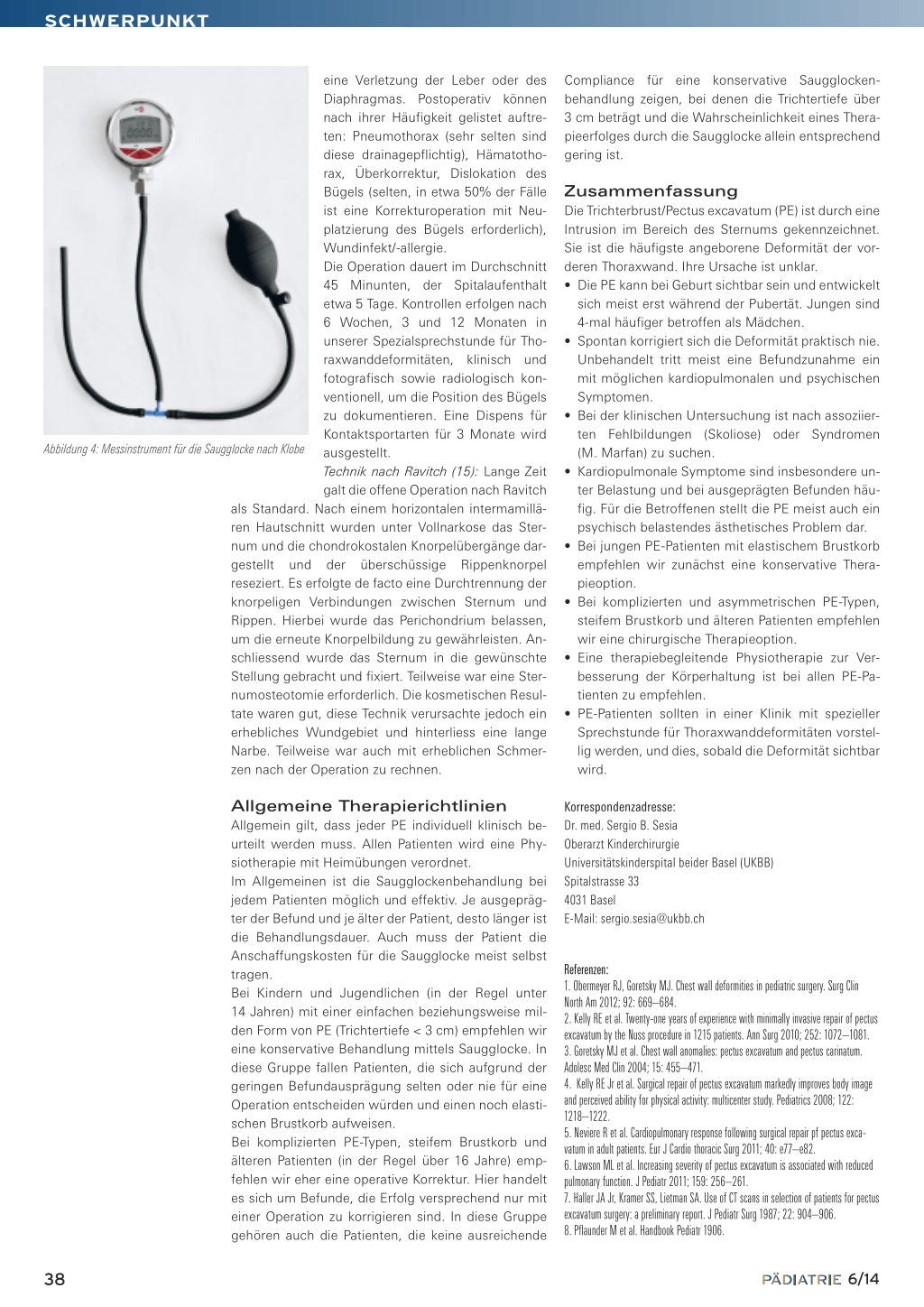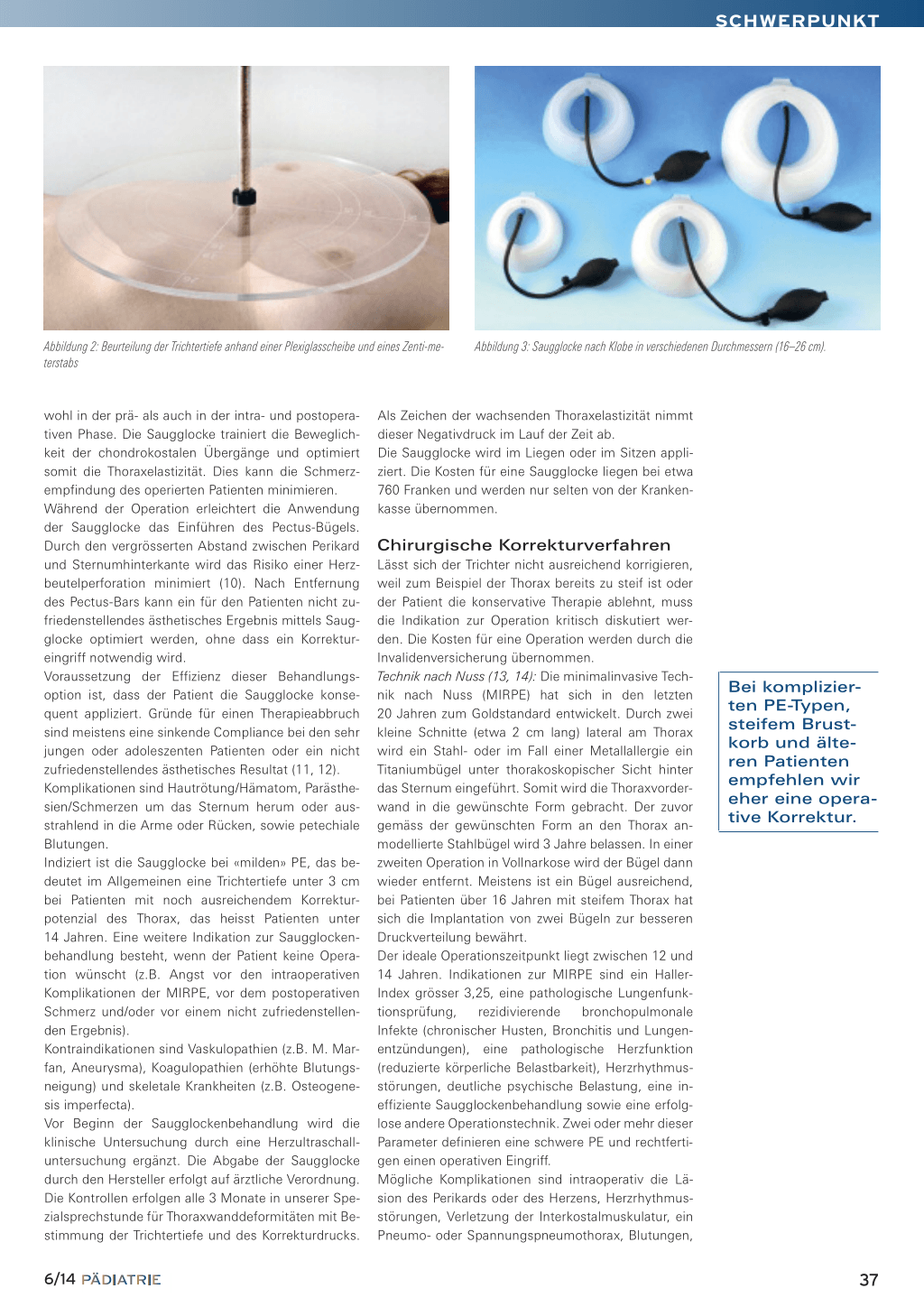 wohl in der prä- als auch in der intra- und postoperativen Phase. Die Saugglocke trainiert die Beweglichkeit der chondrokostalen Übergänge und optimiert somit die Thoraxelastizität. Dies kann die Schmerzempfindung des operierten Patienten minimieren. Während der Operation erleichtert die Anwendung der Saugglocke das Einführen des Pectus-Bügels. Durch den vergrösserten Abstand zwischen Perikard und Sternumhinterkante wird das Risiko einer Herzbeutelperforation minimiert (10). Nach Entfernung des Pectus-Bars kann ein für den Patienten nicht zufriedenstellendes ästhetisches Ergebnis mittels Saugglocke optimiert werden, ohne dass ein Korrektureingriff notwendig wird. Voraussetzung der Effizienz dieser Behandlungsoption ist, dass der Patient die Saugglocke konsequent appliziert. Gründe für einen Therapieabbruch sind meistens eine sinkende Compliance bei den sehr jungen oder adoleszenten Patienten oder ein nicht zufriedenstellendes ästhetisches Resultat (11, 12). Komplikationen sind Hautrötung/Hämatom, Parästhesien/Schmerzen um das Sternum herum oder ausstrahlend in die Arme oder Rücken, sowie petechiale Blutungen. Indiziert ist die Saugglocke bei «milden» PE, das bedeutet im Allgemeinen eine Trichtertiefe unter 3 cm bei Patienten mit noch ausreichendem Korrekturpotenzial des Thorax, das heisst Patienten unter 14 Jahren. Eine weitere Indikation zur Saugglockenbehandlung besteht, wenn der Patient keine Operation wünscht (z.B. Angst vor den intraoperativen Komplikationen der MIRPE, vor dem postoperativen Schmerz und/oder vor einem nicht zufriedenstellenden Ergebnis). Kontraindikationen sind Vaskulopathien (z.B. M. Marfan, Aneurysma), Koagulopathien (erhöhte Blutungsneigung) und skeletale Krankheiten (z.B. Osteogenesis imperfecta). Vor Beginn der Saugglockenbehandlung wird die klinische Untersuchung durch eine Herzultraschalluntersuchung ergänzt. Die Abgabe der Saugglocke durch den Hersteller erfolgt auf ärztliche Verordnung. Die Kontrollen erfolgen alle 3 Monate in unserer Spezialsprechstunde für Thoraxwanddeformitäten mit Bestimmung der Trichtertiefe und des Korrekturdrucks.