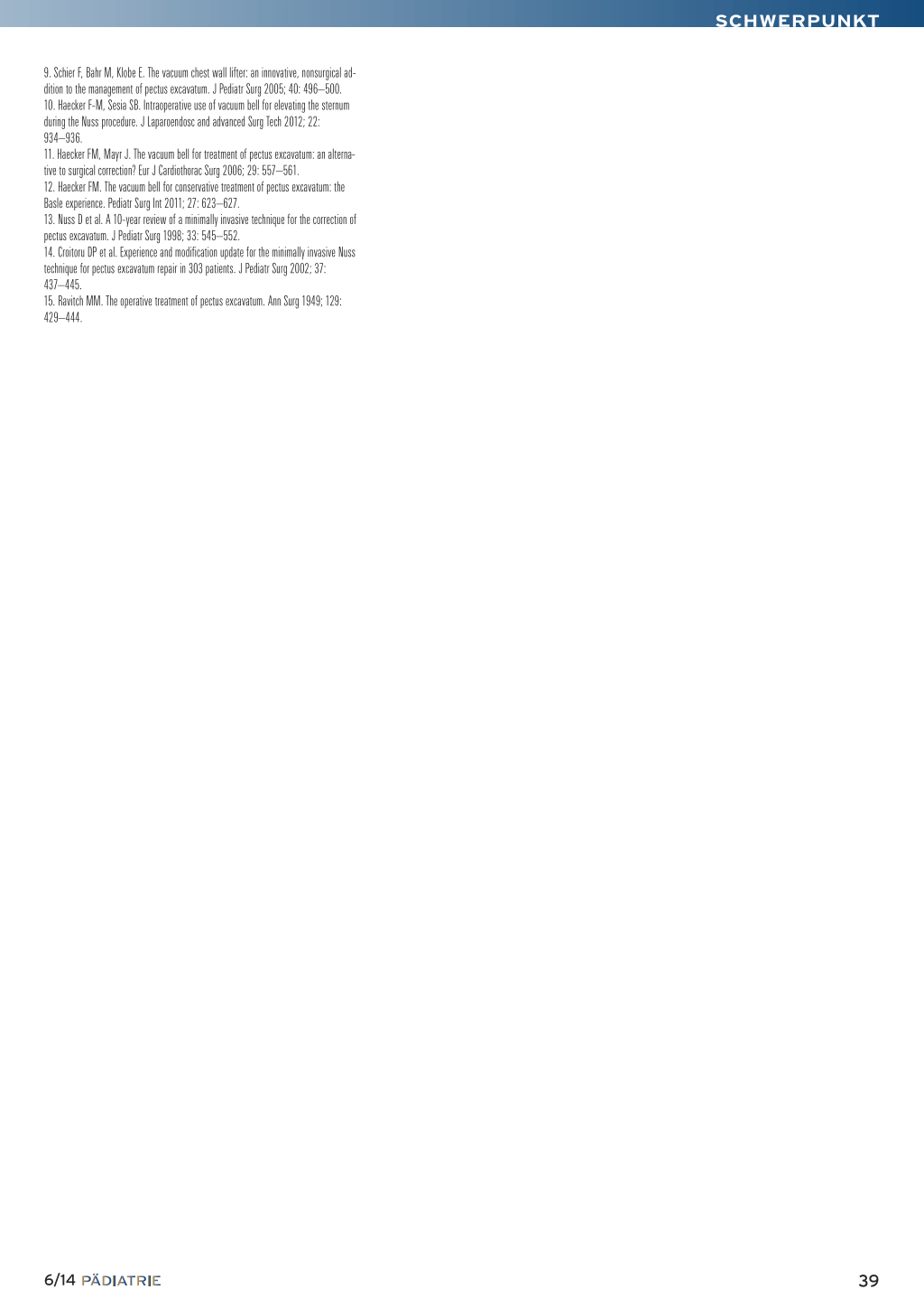 9. Schier F, Bahr M, Klobe E. The vacuum chest wall lifter: an innovative, nonsurgical addition to the management of pectus excavatum. J Pediatr Surg 2005; 40: 496–500. 10. Haecker F-M, Sesia SB. Intraoperative use of vacuum bell for elevating the sternum during the Nuss procedure. J Laparoendosc and advanced Surg Tech 2012; 22: 934–936. 11. Haecker FM, Mayr J. The vacuum bell for treatment of pectus excavatum: an alternative to surgical correction? Eur J Cardiothorac Surg 2006; 29: 557–561. 12. Haecker FM. The vacuum bell for conservative treatment of pectus excavatum: the Basle experience. Pediatr Surg Int 2011; 27: 623–627. 13. Nuss D et al. A 10-year review of a minimally invasive technique for the correction of pectus excavatum. J Pediatr Surg 1998; 33: 545–552. 14. Croitoru DP et al. Experience and modification update for the minimally invasive Nuss technique for pectus excavatum repair in 303 patients. J Pediatr Surg 2002; 37: 437–445. 15. Ravitch MM. The operative treatment of pectus excavatum. Ann Surg 1949; 129: 429–444.