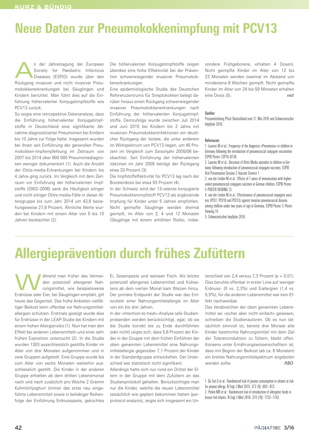 Referenzen: 1. Laurenz M et al.: Frequency of the diagnosis «Pneumonia» in children in Germany following the introduction of pneumococcal conjugate vaccination. ESPID Poster. ESP16-0730. 2. Laurenz M et al.: Decrease of Otitis Media episodes in children in Germany following introduction of pneumococcal conjugate vaccines. ESPID Oral Presentation Session 2-Vaccine Science 1. 3. van der Linden M et al.: Effects of 7 years of immunization with highervalent pneumococcal conjugate vaccines in German children. ESPID Poster. E-POSTER VIEWING 13. 4. van der Linden M et al.: Effectiveness of pneumococcal conjugate vaccines (PCV7, PCV10 and PCV13) against invasive pneumococcal disease among children under two years of age in Germany. ESPID Poster. E-Poster Viewing 14. 5. Schweizerischer Impfplan 2016.
