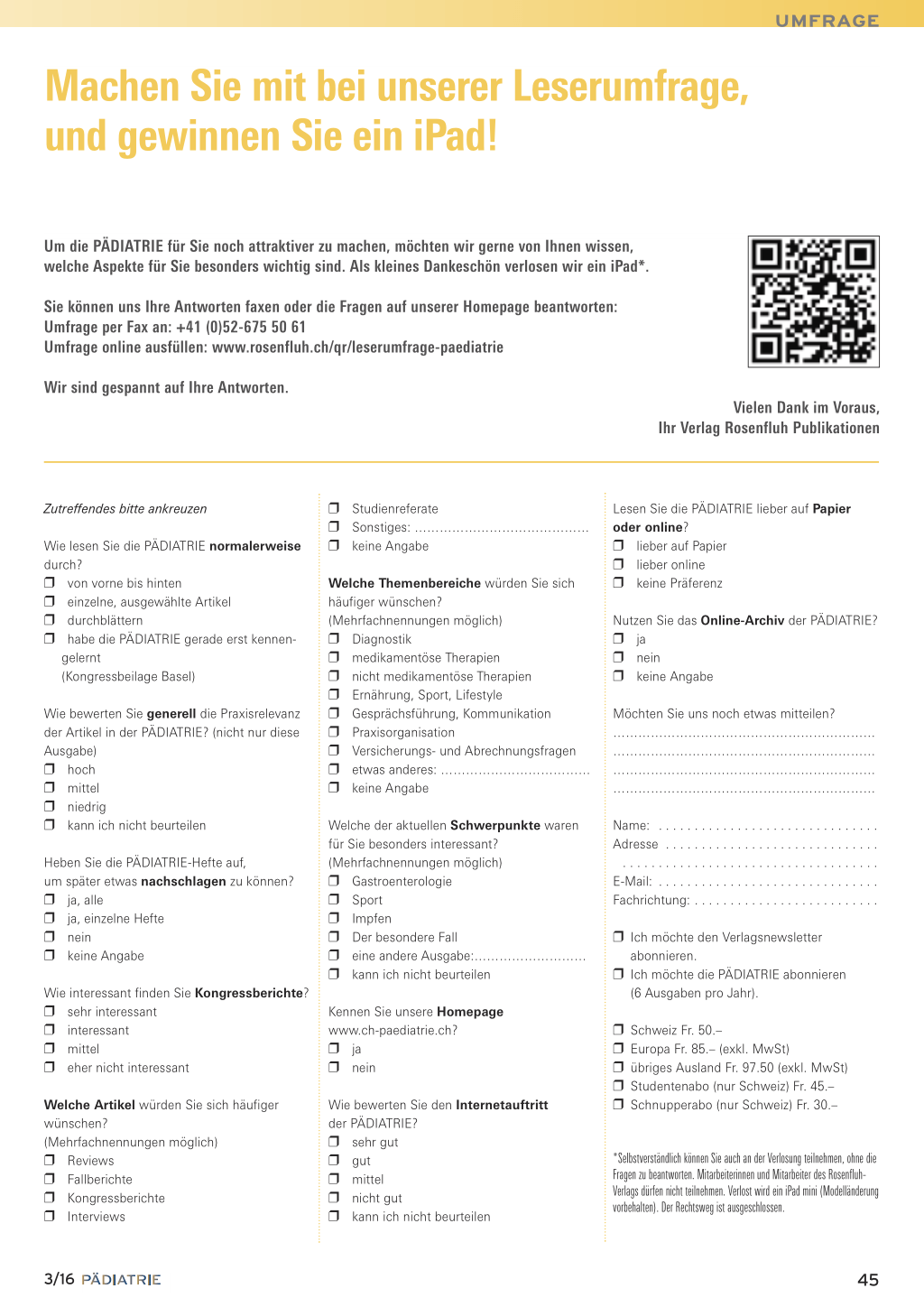 Sie können uns Ihre Antworten faxen oder die Fragen auf unserer Homepage beantworten: Umfrage per Fax an: +41 (0)52-675 50 61 Umfrage online ausfüllen: www.rosenfluh.ch/qr/leserumfrage-paediatrie