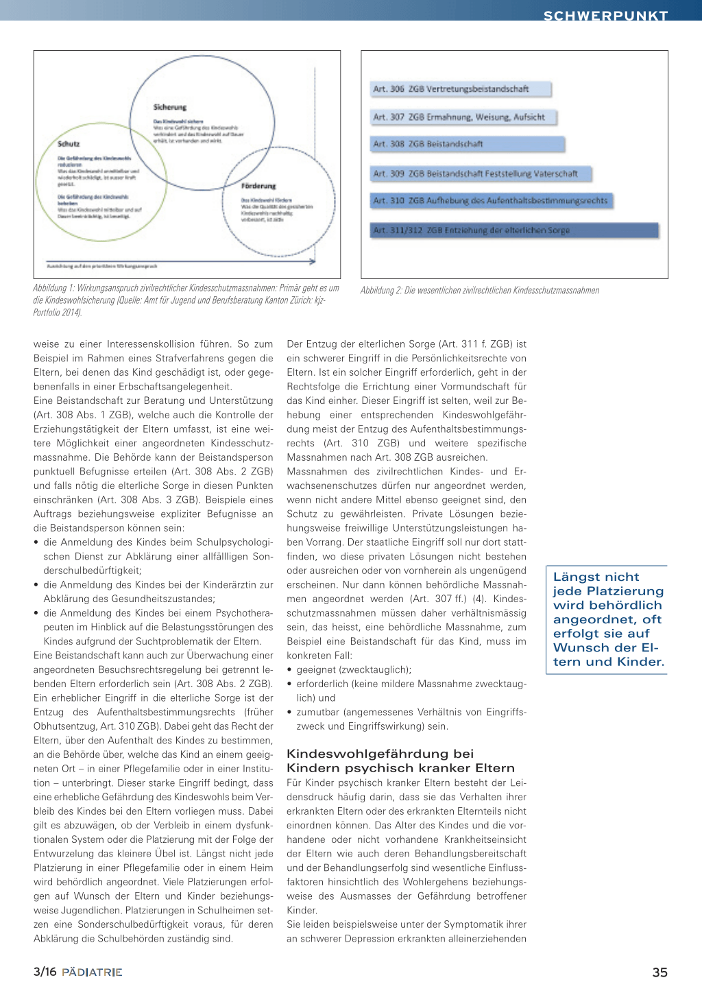 Mutter und verstehen die Ursachen für ihr Verhalten nicht, weil bisher niemand mit ihnen darüber gesprochen beziehungsweise sie darüber aufgeklärt hat. Ähnlich die Kinder eines an einer Schizophrenie erkrankten Vaters, der die Familienangehörigen in sein Wahnsystem integriert und dabei Frau und Kinder überwacht und gar körperlich angreift. Die Beispiele sind so zahlreich wie die Arten psychischer Erkrankungen. Von Bedeutung ist auch, ab welchem Alter und wie lange Kinder solchen Belastungen ausgesetzt sind. Die psychische Erkrankung von Eltern kann das frühkindliche Bindungsverhalten massgeblich und nachhaltig negativ beeinflussen, wobei eine frühkindliche Bindungsstörung, wie zum Beispiel unsicher-vermeidendes Bindungsverhalten, nicht zwangsläufig beim betroffenen Kind zu einer psychischen Störung führen muss. Vor diesem Hintergrund ist die allfällige Kindeswohlgefährdung im konkreten Einzelfall zu beurteilen. Mit einer Situationsanalyse müssen entwicklungsfördernde und -hemmende Faktoren identifiziert und beurteilt werden, um die Art und das Ausmass einer allfälligen Kindeswohlgefährdung einschätzen zu können. In der Folge gilt es, geeignete Massnahmen zu finden und diese auf ihre Zweckmässigkeit zu prüfen. Manchmal sind freiwillige Hilfsangebote ausreichend. Manchmal braucht es behördliche Anordnungen.