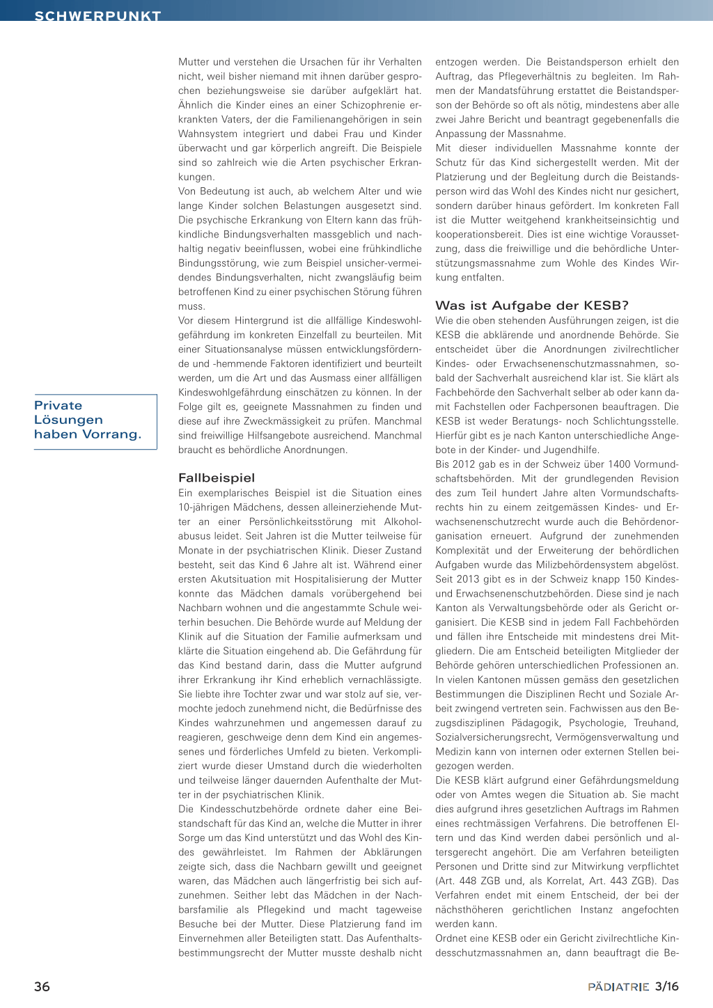 Ein exemplarisches Beispiel ist die Situation eines 10-jährigen Mädchens, dessen alleinerziehende Mutter an einer Persönlichkeitsstörung mit Alkoholabusus leidet. Seit Jahren ist die Mutter teilweise für Monate in der psychiatrischen Klinik. Dieser Zustand besteht, seit das Kind 6 Jahre alt ist. Während einer ersten Akutsituation mit Hospitalisierung der Mutter konnte das Mädchen damals vorübergehend bei Nachbarn wohnen und die angestammte Schule weiterhin besuchen. Die Behörde wurde auf Meldung der Klinik auf die Situation der Familie aufmerksam und klärte die Situation eingehend ab. Die Gefährdung für das Kind bestand darin, dass die Mutter aufgrund ihrer Erkrankung ihr Kind erheblich vernachlässigte. Sie liebte ihre Tochter zwar und war stolz auf sie, vermochte jedoch zunehmend nicht, die Bedürfnisse des Kindes wahrzunehmen und angemessen darauf zu reagieren, geschweige denn dem Kind ein angemessenes und förderliches Umfeld zu bieten. Verkompliziert wurde dieser Umstand durch die wiederholten und teilweise länger dauernden Aufenthalte der Mutter in der psychiatrischen Klinik. Die Kindesschutzbehörde ordnete daher eine Beistandschaft für das Kind an, welche die Mutter in ihrer Sorge um das Kind unterstützt und das Wohl des Kindes gewährleistet. Im Rahmen der Abklärungen zeigte sich, dass die Nachbarn gewillt und geeignet waren, das Mädchen auch längerfristig bei sich aufzunehmen. Seither lebt das Mädchen in der Nachbarsfamilie als Pflegekind und macht tageweise Besuche bei der Mutter. Diese Platzierung fand im Einvernehmen aller Beteiligten statt. Das Aufenthaltsbestimmungsrecht der Mutter musste deshalb nicht