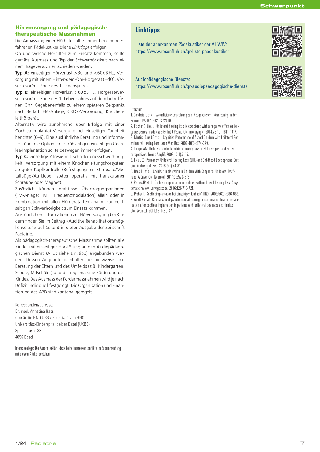 Korrespondenzadresse: Dr. med. Annatina Bass Oberärztin HNO USB / Konsiliarärztin HNO Universitäts-Kinderspital beider Basel (UKBB) Spitalstrasse 33 4056 Basel