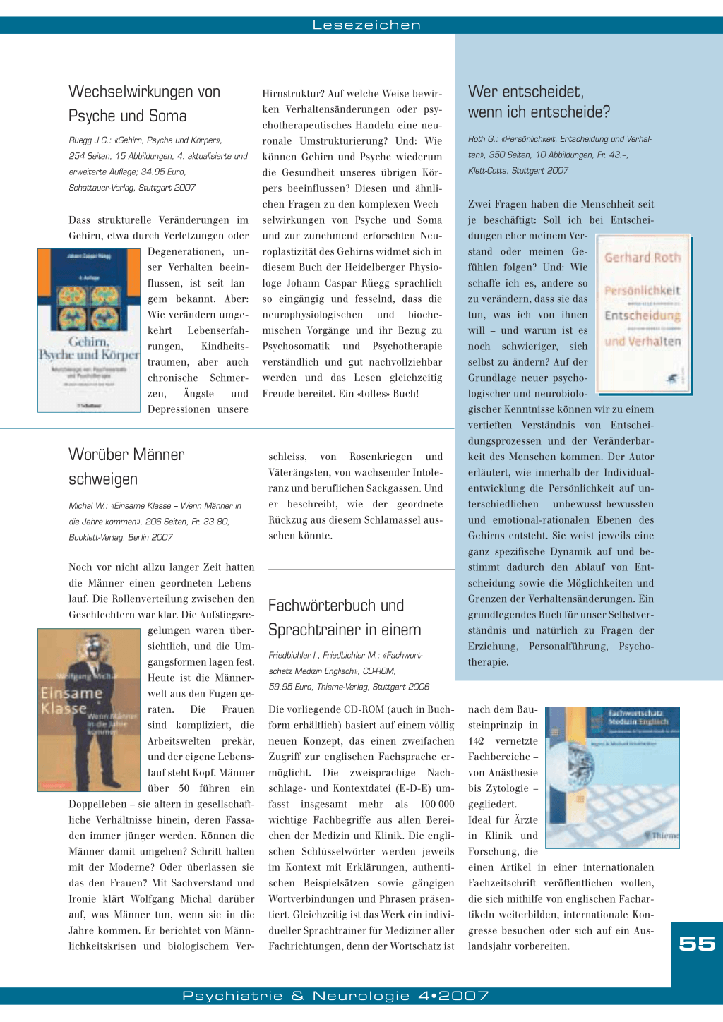 Rüegg J C.: «Gehirn, Psyche und Körper», 254 Seiten, 15 Abbildungen, 4. aktualisierte und erweiterte Auflage; 34.95 Euro, Schattauer-Verlag, Stuttgart 2007