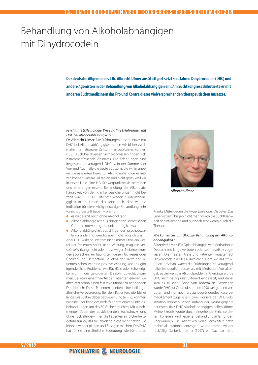Wie kamen Sie auf DHC zur Behandlung der Alkoholabhängigkeit? Albrecht Ulmer: Für Opiatabhängige war Methadon in Deutschland lange verboten oder sehr restriktiv zugelassen. Die meisten Ärzte und Patienten mussten auf Dihydrocodein (DHC) ausweichen. Dort, wo das strukturiert geschah, waren die Erfahrungen hervorragend, teilweise deutlich besser als mit Methadon. Vor allem gab es viel weniger Alkoholprobleme. Allerdings wurde DHC auch häufig unstrukturiert eingesetzt, und dabei kam es zu einer Reihe von Todesfällen. Deswegen wurde DHC zur Opiatsubstitution 1998 weitgehend verboten und nur noch als zu begründendes Reservemedikament zugelassen. Zwei Pioniere der DHC-Substitution konnten schon Anfang der Neunzigerjahre berichten, dass DHC Alkoholabhängigen helfen könne. Meine Skepsis wurde durch eingehende Berichte dieser Kollegen und eigene Behandlungserfahrungen überwunden. Ein Patient war völlig verzweifelt, hatte mehrmals stationär entzogen, wurde immer wieder rückfällig. Da berichtete er (1997), ein Nachbar hätte
