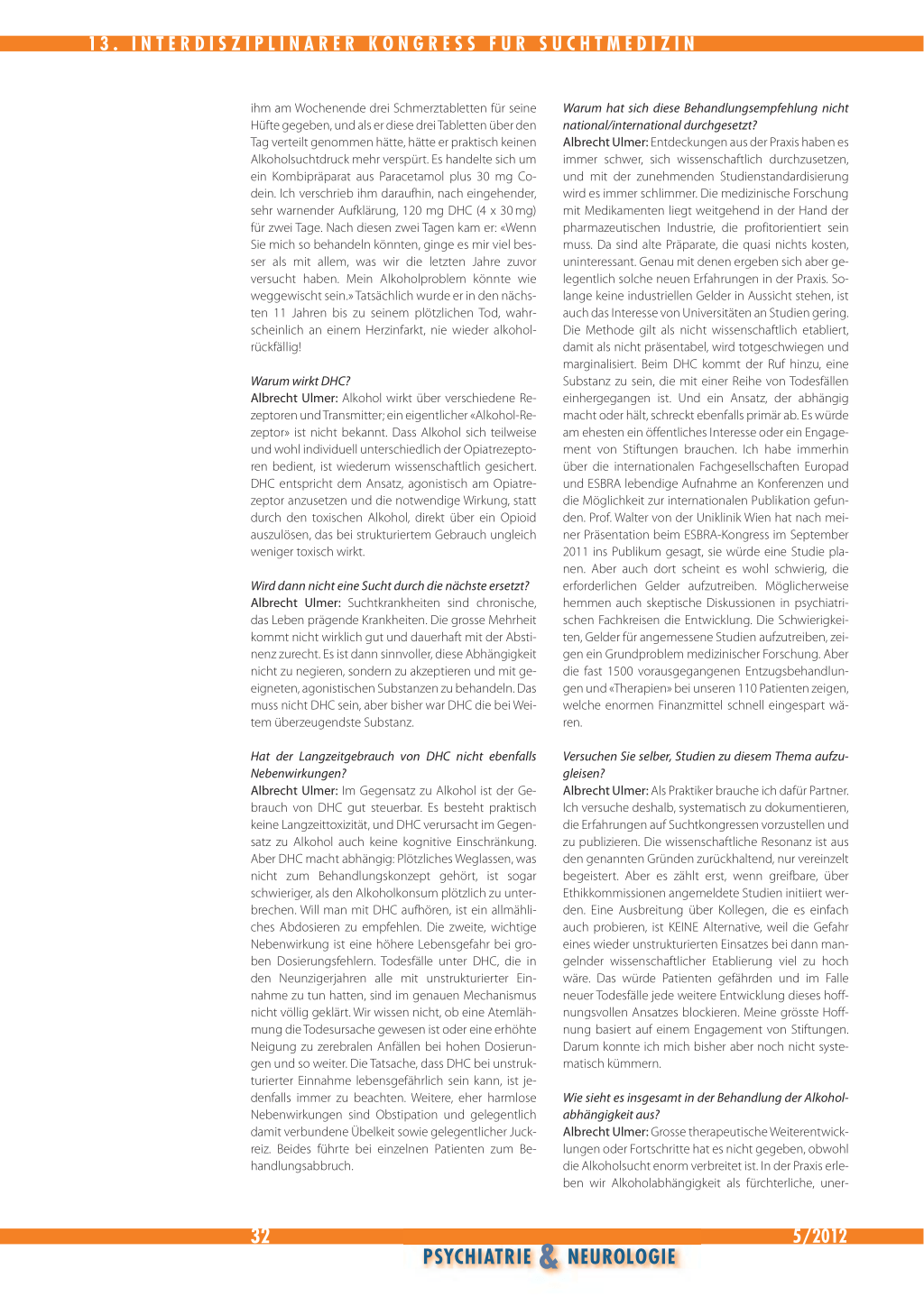 Warum hat sich diese Behandlungsempfehlung nicht national/international durchgesetzt? Albrecht Ulmer: Entdeckungen aus der Praxis haben es immer schwer, sich wissenschaftlich durchzusetzen, und mit der zunehmenden Studienstandardisierung wird es immer schlimmer. Die medizinische Forschung mit Medikamenten liegt weitgehend in der Hand der pharmazeutischen Industrie, die profitorientiert sein muss. Da sind alte Präparate, die quasi nichts kosten, uninteressant. Genau mit denen ergeben sich aber gelegentlich solche neuen Erfahrungen in der Praxis. Solange keine industriellen Gelder in Aussicht stehen, ist auch das Interesse von Universitäten an Studien gering. Die Methode gilt als nicht wissenschaftlich etabliert, damit als nicht präsentabel, wird totgeschwiegen und marginalisiert. Beim DHC kommt der Ruf hinzu, eine Substanz zu sein, die mit einer Reihe von Todesfällen einhergegangen ist. Und ein Ansatz, der abhängig macht oder hält, schreckt ebenfalls primär ab. Es würde am ehesten ein öffentliches Interesse oder ein Engagement von Stiftungen brauchen. Ich habe immerhin über die internationalen Fachgesellschaften Europad und ESBRA lebendige Aufnahme an Konferenzen und die Möglichkeit zur internationalen Publikation gefunden. Prof. Walter von der Uniklinik Wien hat nach meiner Präsentation beim ESBRA-Kongress im September 2011 ins Publikum gesagt, sie würde eine Studie planen. Aber auch dort scheint es wohl schwierig, die erforderlichen Gelder aufzutreiben. Möglicherweise hemmen auch skeptische Diskussionen in psychiatrischen Fachkreisen die Entwicklung. Die Schwierigkeiten, Gelder für angemessene Studien aufzutreiben, zeigen ein Grundproblem medizinischer Forschung. Aber die fast 1500 vorausgegangenen Entzugsbehandlungen und «Therapien» bei unseren 110 Patienten zeigen, welche enormen Finanzmittel schnell eingespart wären.