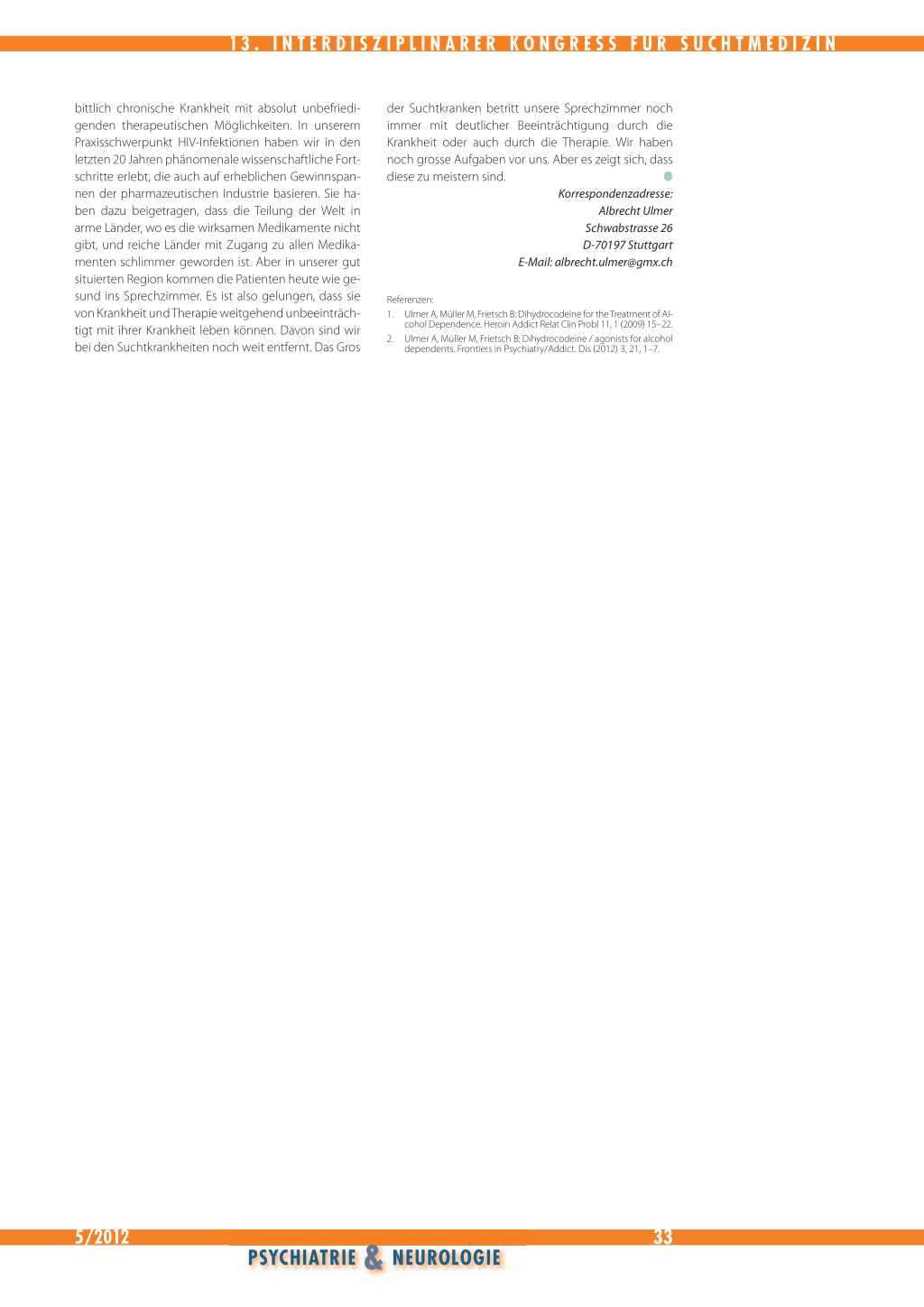 2. Ulmer A, Müller M, Frietsch B: Dihydrocodeine / agonists for alcohol dependents. Frontiers in Psychiatry/Addict. Dis (2012) 3, 21, 1–7.