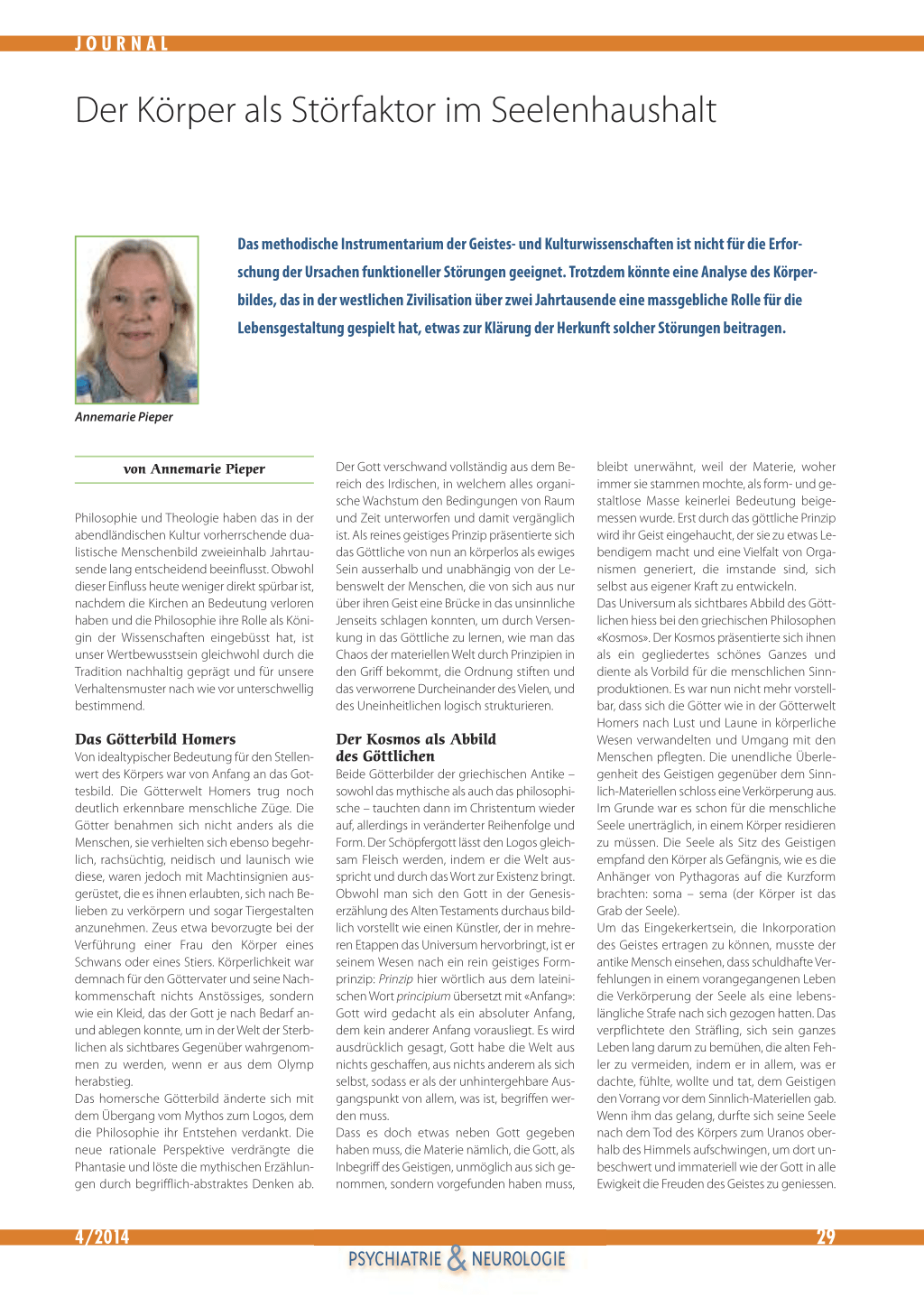 Das methodische Instrumentarium der Geistes- und Kulturwissenschaften ist nicht für die Erforschung der Ursachen funktioneller Störungen geeignet. Trotzdem könnte eine Analyse des Körperbildes, das in der westlichen Zivilisation über zwei Jahrtausende eine massgebliche Rolle für die Lebensgestaltung gespielt hat, etwas zur Klärung der Herkunft solcher Störungen beitragen.