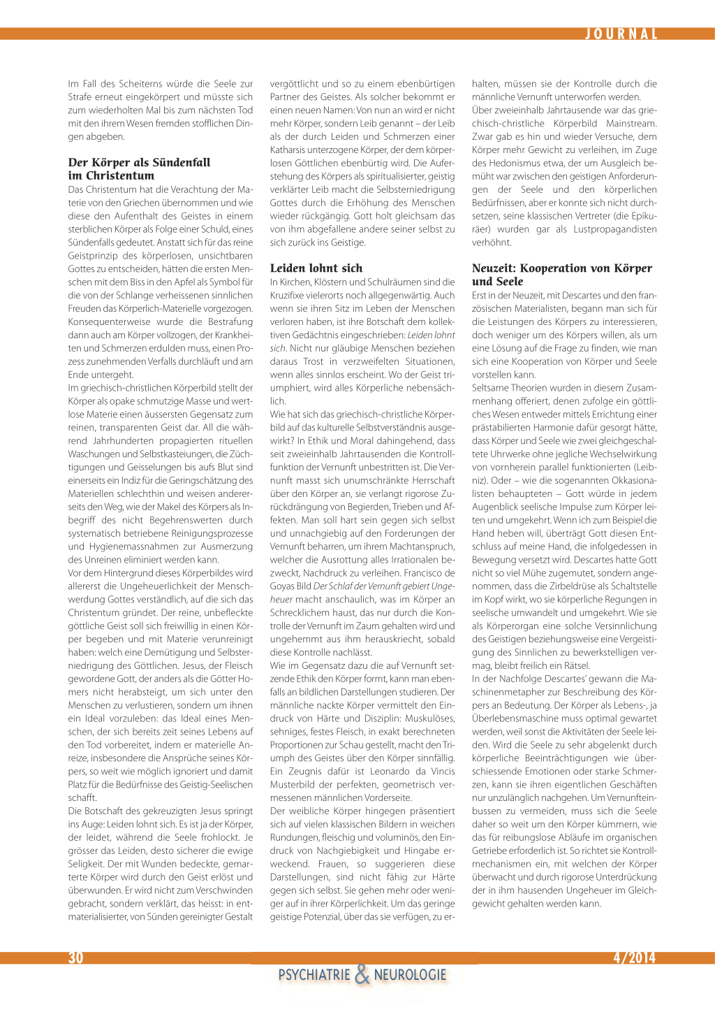 halten, müssen sie der Kontrolle durch die männliche Vernunft unterworfen werden. Über zweieinhalb Jahrtausende war das griechisch-christliche Körperbild Mainstream. Zwar gab es hin und wieder Versuche, dem Körper mehr Gewicht zu verleihen, im Zuge des Hedonismus etwa, der um Ausgleich bemüht war zwischen den geistigen Anforderungen der Seele und den körperlichen Bedürfnissen, aber er konnte sich nicht durchsetzen, seine klassischen Vertreter (die Epikuräer) wurden gar als Lustpropagandisten verhöhnt.