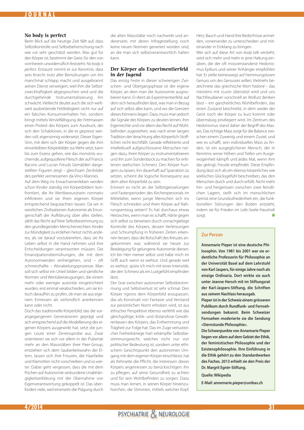 Der Körper als Experimentierfeld in der Jugend Das einzig Feste in dieser schwierigen Zwischen- und Übergangsphase ist der eigene Körper, an dem man die Autonomie ausprobieren kann. Er dient als Experimentierfeld, auf dem sich herausfinden lässt, was man in Bezug auf sich selbst alles kann, und wo die Grenzen dieses Könnens liegen. Dazu muss man jedoch die Signale des Körpers zu deuten lernen, ihm Eigenrechte und vor allem das Recht auf Wohlbefinden zugestehen, was nach einer langen Tradition der Verachtung alles Körperlich-Stofflichen nicht leichtfällt. Gerade reflektierte und intellektuell aufgeschlossene Menschen neigen dazu, ihren Körper zu instrumentalisieren und ihn zum Sündenbock zu machen für erlittenen seelischen Schmerz. Den Körper hungern zu lassen, ihn dauerhaft auf Sparration zu setzen, scheint die logische Konsequenz aus dem alten Körperbild zu sein. Erinnert es nicht an die Selbstgeisselungen und Fastenperioden des Kirchenpersonals im Mittelalter, wenn junge Menschen sich ins Fleisch schneiden und ihren Körper auf Nahrungsentzug setzen? Es hat durchaus etwas Heroisches, wenn man es schafft, Härte gegen sich selbst zu beweisen durch unnachgiebige Kontrolle des Körpers, dessen Verletzungen und Schrumpfung in früheren Zeiten erkennen liessen, dass die Botschaft des Kreuzes angekommen war, während sie heute zur Bestätigung für gelungene Autonomie dienen. Ich bin Herr meiner selbst und habe mich im Griff, auch wenn es wehtut. Und gerade weil es wehtut, spüre ich mich mit einer Intensität, die den Schmerz als ein Lustgefühl empfinden lässt. Der Grat zwischen autonomer Selbstbestimmung und Selbstverlust ist sehr schmal. Den Körper rigoros dem Körperbild anzupassen, das als Konstrukt von Fantasie und Verstand zur persönlichen Norm erhoben wird, ist aus ethischer Perspektive ebenso verfehlt wie das gleichgültige, kritik- und distanzlose Gewährenlassen des Körpers, das Enthemmung und Trägheit zur Folge hat. Das im Zuge verlustreicher Freiheitskriege hart erkämpfte Selbstbestimmungsrecht, welches nicht nur von politischer Bedeutung ist, sondern unter ethischem Gesichtspunkt den autonomen Umgang mit dem eigenen Körper einschliesst, hat als Kehrseite die Pflicht, die Interessen dieses Körpers angemessen zu berücksichtigen: ihn zu pflegen, auf seine Gesundheit zu achten und für sein Wohlbefinden zu sorgen. Dazu muss man lernen, in seinen Körper hineinzuhorchen, die Stimmen, mittels welcher Kopf,