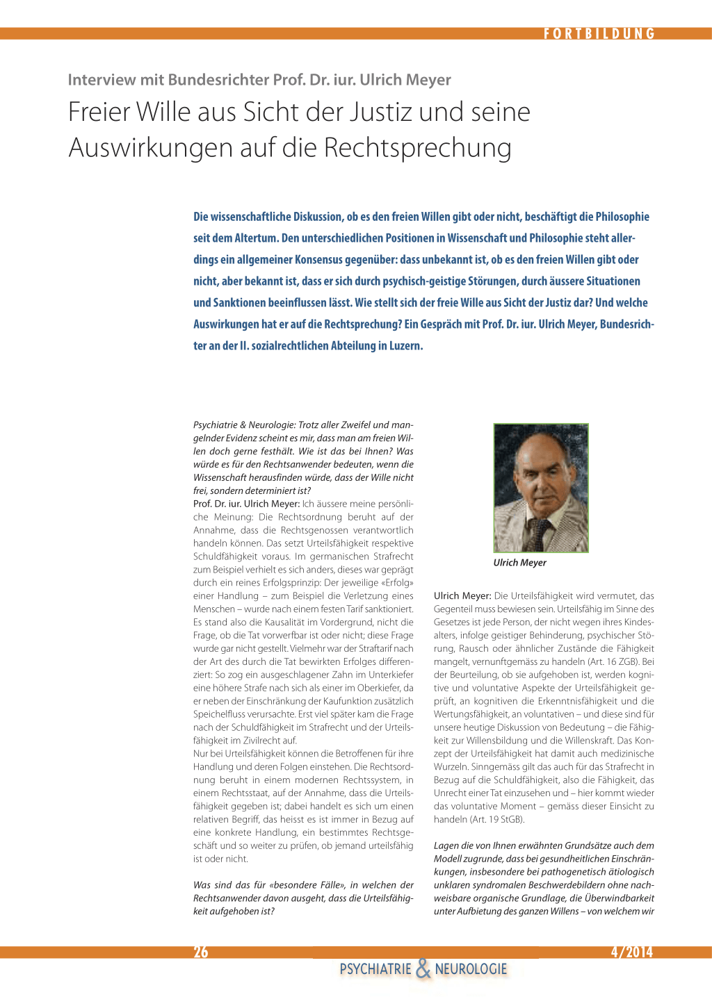 Psychiatrie & Neurologie: Trotz aller Zweifel und mangelnder Evidenz scheint es mir, dass man am freien Willen doch gerne festhält. Wie ist das bei Ihnen? Was würde es für den Rechtsanwender bedeuten, wenn die Wissenschaft herausfinden würde, dass der Wille nicht frei, sondern determiniert ist? Prof. Dr. iur. Ulrich Meyer: Ich äussere meine persönliche Meinung: Die Rechtsordnung beruht auf der Annahme, dass die Rechtsgenossen verantwortlich handeln können. Das setzt Urteilsfähigkeit respektive Schuldfähigkeit voraus. Im germanischen Strafrecht zum Beispiel verhielt es sich anders, dieses war geprägt durch ein reines Erfolgsprinzip: Der jeweilige «Erfolg» einer Handlung – zum Beispiel die Verletzung eines Menschen – wurde nach einem festen Tarif sanktioniert. Es stand also die Kausalität im Vordergrund, nicht die Frage, ob die Tat vorwerfbar ist oder nicht; diese Frage wurde gar nicht gestellt. Vielmehr war der Straftarif nach der Art des durch die Tat bewirkten Erfolges differenziert: So zog ein ausgeschlagener Zahn im Unterkiefer eine höhere Strafe nach sich als einer im Oberkiefer, da er neben der Einschränkung der Kaufunktion zusätzlich Speichelfluss verursachte. Erst viel später kam die Frage nach der Schuldfähigkeit im Strafrecht und der Urteilsfähigkeit im Zivilrecht auf. Nur bei Urteilsfähigkeit können die Betroffenen für ihre Handlung und deren Folgen einstehen. Die Rechtsordnung beruht in einem modernen Rechtssystem, in einem Rechtsstaat, auf der Annahme, dass die Urteilsfähigkeit gegeben ist; dabei handelt es sich um einen relativen Begriff, das heisst es ist immer in Bezug auf eine konkrete Handlung, ein bestimmtes Rechtsgeschäft und so weiter zu prüfen, ob jemand urteilsfähig ist oder nicht.