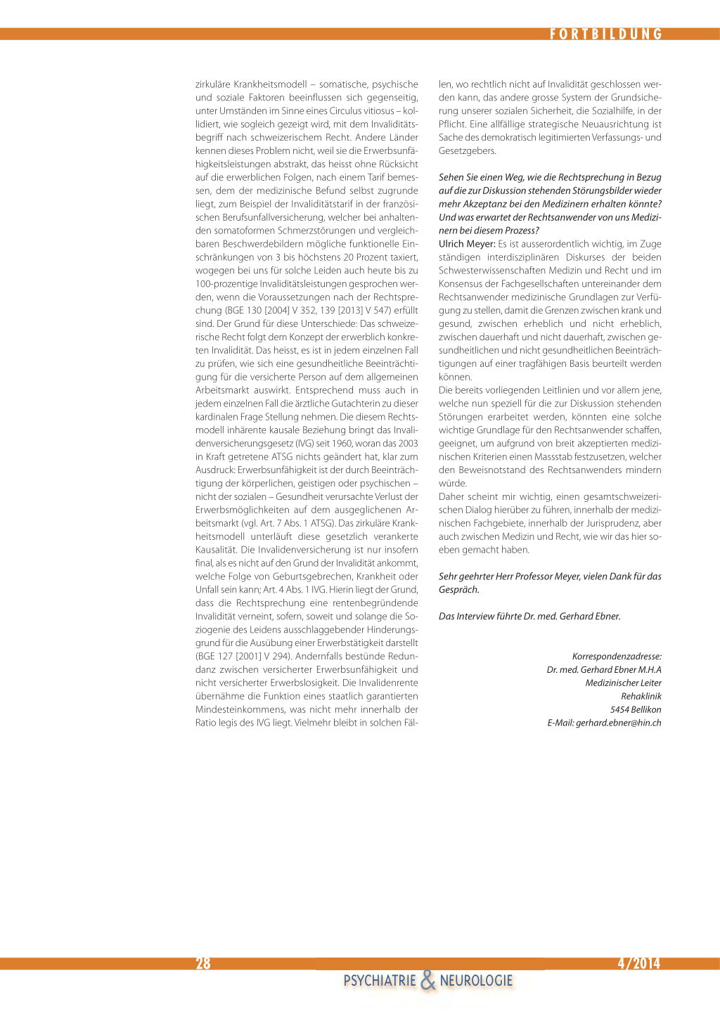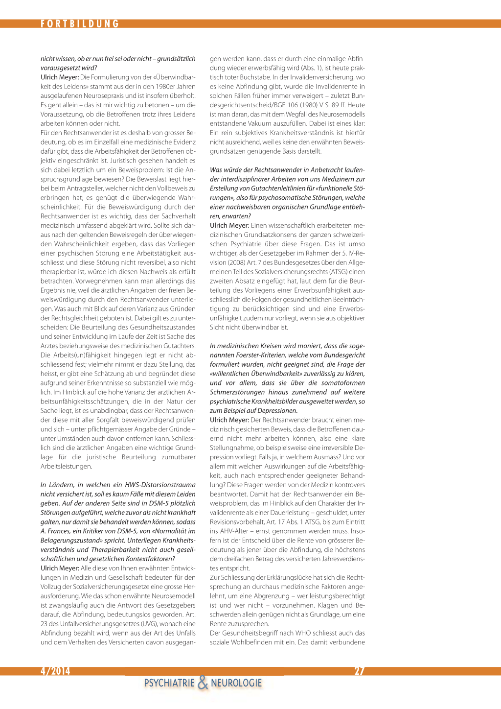Was würde der Rechtsanwender in Anbetracht laufender interdisziplinärer Arbeiten von uns Medizinern zur Erstellung von Gutachtenleitlinien für «funktionelle Störungen», also für psychosomatische Störungen, welche einer nachweisbaren organischen Grundlage entbehren, erwarten? Ulrich Meyer: Einen wissenschaftlich erarbeiteten medizinischen Grundsatzkonsens der ganzen schweizerischen Psychiatrie über diese Fragen. Das ist umso wichtiger, als der Gesetzgeber im Rahmen der 5. IV-Revision (2008) Art. 7 des Bundesgesetzes über den Allgemeinen Teil des Sozialversicherungsrechts (ATSG) einen zweiten Absatz eingefügt hat, laut dem für die Beurteilung des Vorliegens einer Erwerbsunfähigkeit ausschliesslich die Folgen der gesundheitlichen Beeinträchtigung zu berücksichtigen sind und eine Erwerbsunfähigkeit zudem nur vorliegt, wenn sie aus objektiver Sicht nicht überwindbar ist.