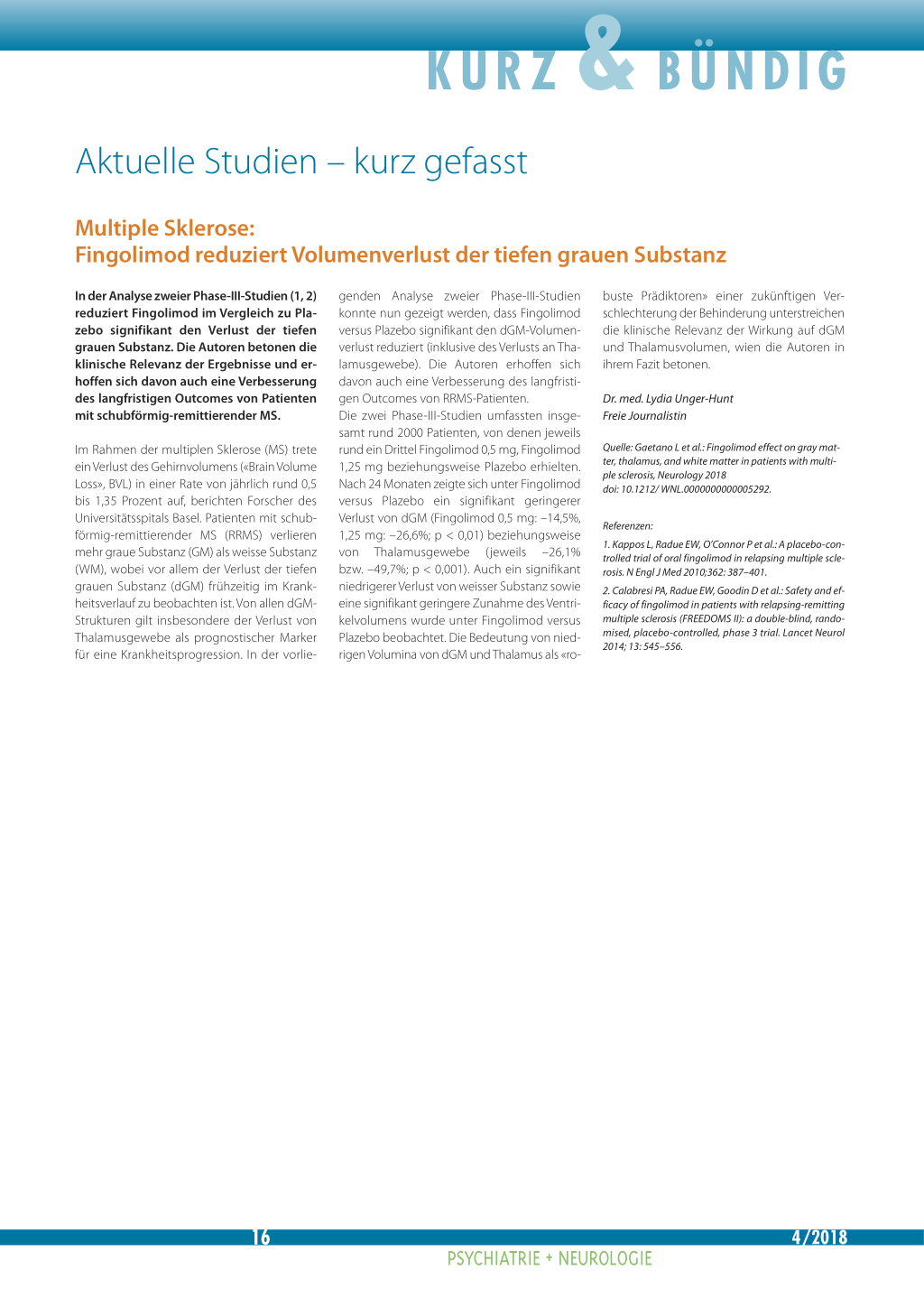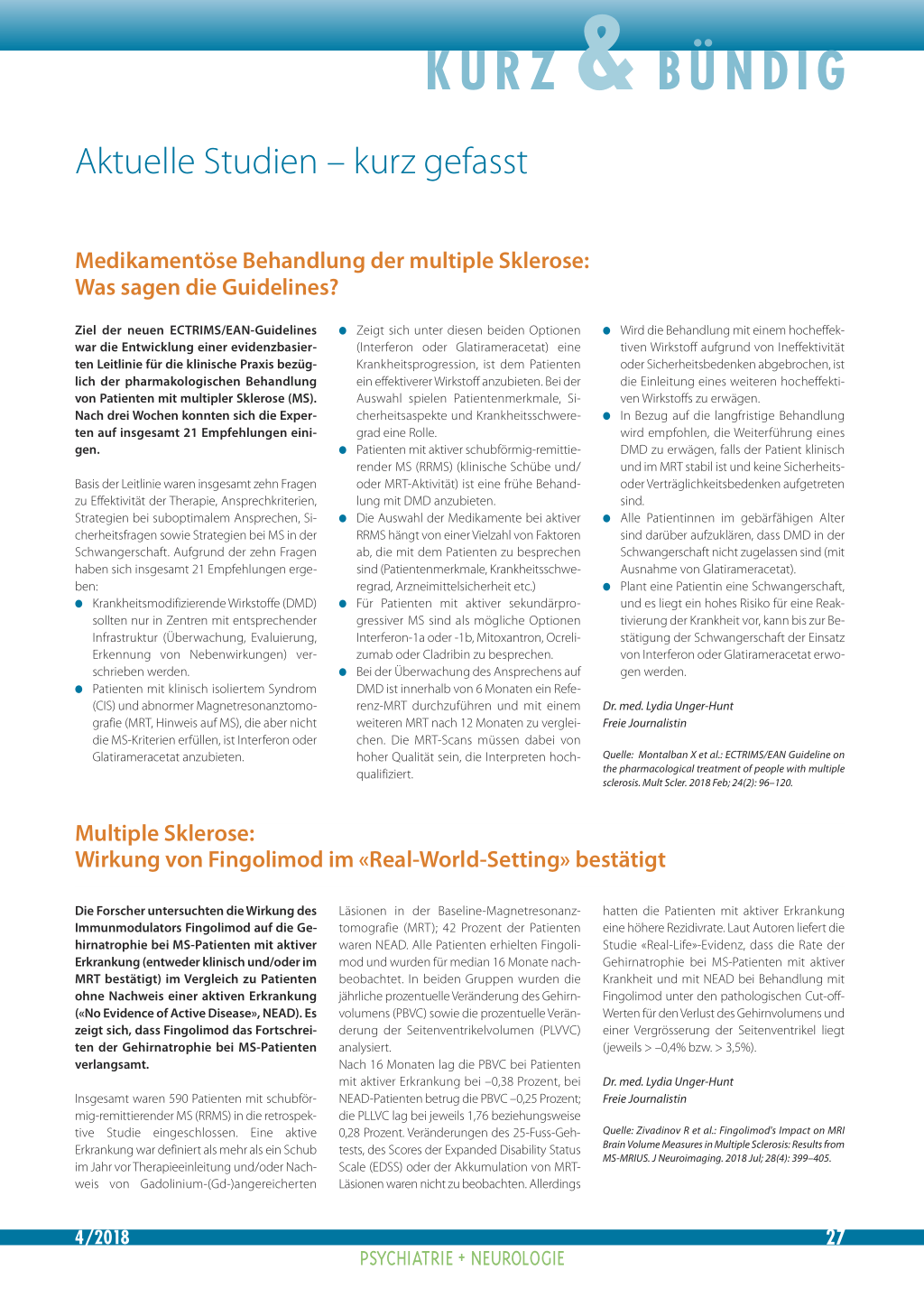 genden Analyse zweier Phase-III-Studien konnte nun gezeigt werden, dass Fingolimod versus Plazebo signifikant den dGM-Volumenverlust reduziert (inklusive des Verlusts an Thalamusgewebe). Die Autoren erhoffen sich davon auch eine Verbesserung des langfristigen Outcomes von RRMS-Patienten. Die zwei Phase-III-Studien umfassten insgesamt rund 2000 Patienten, von denen jeweils rund ein Drittel Fingolimod 0,5 mg, Fingolimod 1,25 mg beziehungsweise Plazebo erhielten. Nach 24 Monaten zeigte sich unter Fingolimod versus Plazebo ein signifikant geringerer Verlust von dGM (Fingolimod 0,5 mg: –14,5%, 1,25 mg: –26,6%; p < 0,01) beziehungsweise von Thalamusgewebe (jeweils –26,1% bzw. –49,7%; p < 0,001). Auch ein signifikant niedrigerer Verlust von weisser Substanz sowie eine signifikant geringere Zunahme des Ventrikelvolumens wurde unter Fingolimod versus Plazebo beobachtet. Die Bedeutung von niedrigen Volumina von dGM und Thalamus als «ro- buste Prädiktoren» einer zukünftigen Verschlechterung der Behinderung unterstreichen die klinische Relevanz der Wirkung auf dGM und Thalamusvolumen, wien die Autoren in ihrem Fazit betonen. Dr. med. Lydia Unger-Hunt Freie Journalistin Quelle: Gaetano L et al.: Fingolimod effect on gray matter, thalamus, and white matter in patients with multiple sclerosis, Neurology 2018 doi: 10.1212/ WNL.0000000000005292. Referenzen: 1. Kappos L, Radue EW, O’Connor P et al.: A placebo-controlled trial of oral fingolimod in relapsing multiple sclerosis. N Engl J Med 2010;362: 387–401. 2. Calabresi PA, Radue EW, Goodin D et al.: Safety and efficacy of fingolimod in patients with relapsing-remitting multiple sclerosis (FREEDOMS II): a double-blind, randomised, placebo-controlled, phase 3 trial. Lancet Neurol 2014; 13: 545–556. 16 4/2018 PSYCHIATRIE + NEUROLOGIE &K U R Z B Ü N D I G Aktuelle Studien – kurz gefasst Medikamentöse Behandlung der multiple Sklerose: Was sagen die Guidelines? Ziel der neuen ECTRIMS/EAN-Guidelines war die Entwicklung einer evidenzbasierten Leitlinie für die klinische Praxis bezüglich der pharmakologischen Behandlung von Patienten mit multipler Sklerose (MS). Nach drei Wochen konnten sich die Experten auf insgesamt 21 Empfehlungen einigen. Basis der Leitlinie waren insgesamt zehn Fragen zu Effektivität der Therapie, Ansprechkriterien, Strategien bei suboptimalem Ansprechen, Sicherheitsfragen sowie Strategien bei MS in der Schwangerschaft. Aufgrund der zehn Fragen haben sich insgesamt 21 Empfehlungen ergeben: G Krankheitsmodifizierende Wirkstoffe (DMD) sollten nur in Zentren mit entsprechender Infrastruktur (Überwachung, Evaluierung, Erkennung von Nebenwirkungen) verschrieben werden. G Patienten mit klinisch isoliertem Syndrom (CIS) und abnormer Magnetresonanztomografie (MRT, Hinweis auf MS), die aber nicht die MS-Kriterien erfüllen, ist Interferon oder Glatirameracetat anzubieten. G Zeigt sich unter diesen beiden Optionen (Interferon oder Glatirameracetat) eine Krankheitsprogression, ist dem Patienten ein effektiverer Wirkstoff anzubieten. Bei der Auswahl spielen Patientenmerkmale, Sicherheitsaspekte und Krankheitsschweregrad eine Rolle. G Patienten mit aktiver schubförmig-remittierender MS (RRMS) (klinische Schübe und/ oder MRT-Aktivität) ist eine frühe Behandlung mit DMD anzubieten. G Die Auswahl der Medikamente bei aktiver RRMS hängt von einer Vielzahl von Faktoren ab, die mit dem Patienten zu besprechen sind (Patientenmerkmale, Krankheitsschweregrad, Arzneimittelsicherheit etc.) G Für Patienten mit aktiver sekundärprogressiver MS sind als mögliche Optionen Interferon-1a oder -1b, Mitoxantron, Ocrelizumab oder Cladribin zu besprechen. G Bei der Überwachung des Ansprechens auf DMD ist innerhalb von 6 Monaten ein Referenz-MRT durchzuführen und mit einem weiteren MRT nach 12 Monaten zu vergleichen. Die MRT-Scans müssen dabei von hoher Qualität sein, die Interpreten hochqualifiziert. G Wird die Behandlung mit einem hocheffektiven Wirkstoff aufgrund von Ineffektivität oder Sicherheitsbedenken abgebrochen, ist die Einleitung eines weiteren hocheffektiven Wirkstoffs zu erwägen. G In Bezug auf die langfristige Behandlung wird empfohlen, die Weiterführung eines DMD zu erwägen, falls der Patient klinisch und im MRT stabil ist und keine Sicherheitsoder Verträglichkeitsbedenken aufgetreten sind. G Alle Patientinnen im gebärfähigen Alter sind darüber aufzuklären, dass DMD in der Schwangerschaft nicht zugelassen sind (mit Ausnahme von Glatirameracetat). G Plant eine Patientin eine Schwangerschaft, und es liegt ein hohes Risiko für eine Reaktivierung der Krankheit vor, kann bis zur Bestätigung der Schwangerschaft der Einsatz von Interferon oder Glatirameracetat erwogen werden. Dr. med. Lydia Unger-Hunt Freie Journalistin Quelle: Montalban X et al.: ECTRIMS/EAN Guideline on the pharmacological treatment of people with multiple sclerosis. Mult Scler. 2018 Feb; 24(2): 96–120. Multiple Sklerose: Wirkung von Fingolimod im «Real-World-Setting» bestätigt Die Forscher untersuchten die Wirkung des Immunmodulators Fingolimod auf die Gehirnatrophie bei MS-Patienten mit aktiver Erkrankung (entweder klinisch und/oder im MRT bestätigt) im Vergleich zu Patienten ohne Nachweis einer aktiven Erkrankung («No Evidence of Active Disease», NEAD). Es zeigt sich, dass Fingolimod das Fortschreiten der Gehirnatrophie bei MS-Patienten verlangsamt. Insgesamt waren 590 Patienten mit schubförmig-remittierender MS (RRMS) in die retrospektive Studie eingeschlossen. Eine aktive Erkrankung war definiert als mehr als ein Schub im Jahr vor Therapieeinleitung und/oder Nachweis von Gadolinium-(Gd-)angereicherten Läsionen in der Baseline-Magnetresonanztomografie (MRT); 42 Prozent der Patienten waren NEAD. Alle Patienten erhielten Fingolimod und wurden für median 16 Monate nachbeobachtet. In beiden Gruppen wurden die jährliche prozentuelle Veränderung des Gehirnvolumens (PBVC) sowie die prozentuelle Veränderung der Seitenventrikelvolumen (PLVVC) 