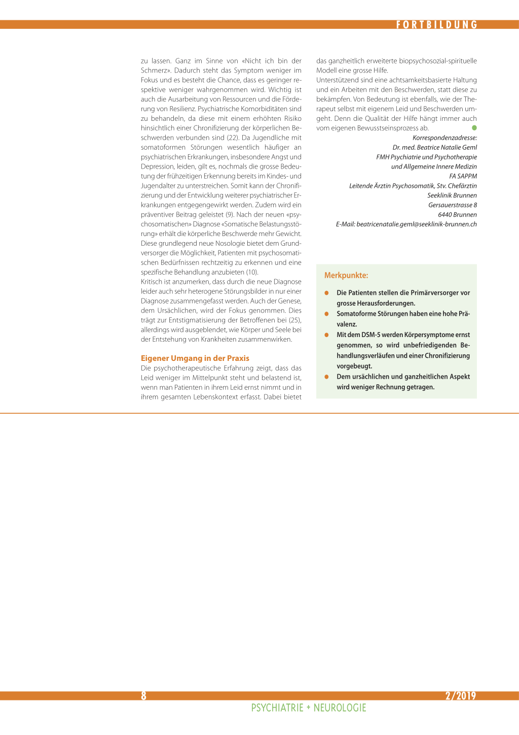 zu lassen. Ganz im Sinne von «Nicht ich bin der Schmerz». Dadurch steht das Symptom weniger im Fokus und es besteht die Chance, dass es geringer respektive weniger wahrgenommen wird. Wichtig ist auch die Ausarbeitung von Ressourcen und die Förderung von Resilienz. Psychiatrische Komorbiditäten sind zu behandeln, da diese mit einem erhöhten Risiko hinsichtlich einer Chronifizierung der körperlichen Beschwerden verbunden sind (22). Da Jugendliche mit somatoformen Störungen wesentlich häufiger an psychiatrischen Erkrankungen, insbesondere Angst und Depression, leiden, gilt es, nochmals die grosse Bedeutung der frühzeitigen Erkennung bereits im Kindes- und Jugendalter zu unterstreichen. Somit kann der Chronifizierung und der Entwicklung weiterer psychiatrischer Erkrankungen entgegengewirkt werden. Zudem wird ein präventiver Beitrag geleistet (9). Nach der neuen «psychosomatischen» Diagnose «Somatische Belastungsstörung» erhält die körperliche Beschwerde mehr Gewicht. Diese grundlegend neue Nosologie bietet dem Grundversorger die Möglichkeit, Patienten mit psychosomatischen Bedürfnissen rechtzeitig zu erkennen und eine spezifische Behandlung anzubieten (10). Kritisch ist anzumerken, dass durch die neue Diagnose leider auch sehr heterogene Störungsbilder in nur einer Diagnose zusammengefasst werden. Auch der Genese, dem Ursächlichen, wird der Fokus genommen. Dies trägt zur Entstigmatisierung der Betroffenen bei (25), allerdings wird ausgeblendet, wie Körper und Seele bei der Entstehung von Krankheiten zusammenwirken.