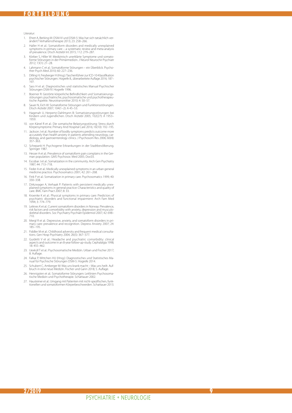 3. Körber S, Hiller W: Medizinisch unerklärte Symptome und somatoforme Störungen in der Primärmedizin. J Neurol Neurochir Psychiatr 2012; 13(1): 21–28.