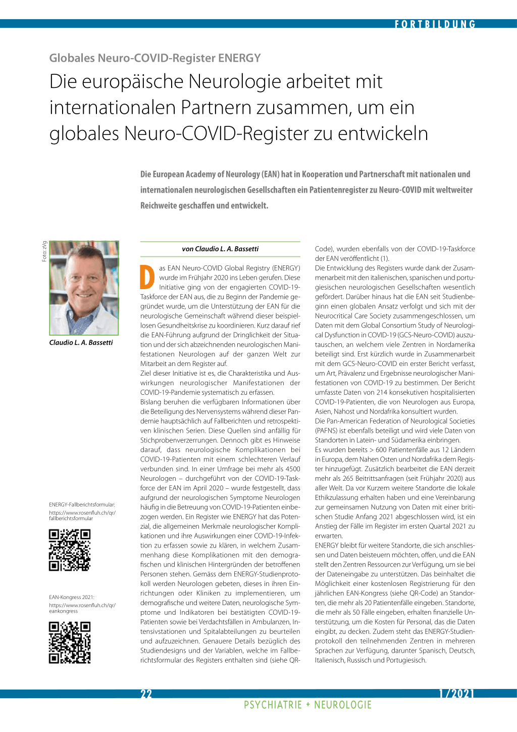 D as EAN Neuro-COVID Global Registry (ENERGY) wurde im Frühjahr 2020 ins Leben gerufen. Diese Initiative ging von der engagierten COVID-19Taskforce der EAN aus, die zu Beginn der Pandemie gegründet wurde, um die Unterstützung der EAN für die neurologische Gemeinschaft während dieser beispiellosen Gesundheitskrise zu koordinieren. Kurz darauf rief die EAN-Führung aufgrund der Dringlichkeit der Situation und der sich abzeichnenden neurologischen Manifestationen Neurologen auf der ganzen Welt zur Mitarbeit an dem Register auf. Ziel dieser Initiative ist es, die Charakteristika und Auswirkungen neurologischer Manifestationen der COVID-19-Pandemie systematisch zu erfassen. Bislang beruhen die verfügbaren Informationen über die Beteiligung des Nervensystems während dieser Pandemie hauptsächlich auf Fallberichten und retrospektiven klinischen Serien. Diese Quellen sind anfällig für Stichprobenverzerrungen. Dennoch gibt es Hinweise darauf, dass neurologische Komplikationen bei COVID-19-Patienten mit einem schlechteren Verlauf verbunden sind. In einer Umfrage bei mehr als 4500 Neurologen – durchgeführt von der COVID-19-Taskforce der EAN im April 2020 – wurde festgestellt, dass aufgrund der neurologischen Symptome Neurologen häufig in die Betreuung von COVID-19-Patienten einbezogen werden. Ein Register wie ENERGY hat das Potenzial, die allgemeinen Merkmale neurologischer Komplikationen und ihre Auswirkungen einer COVID-19-Infektion zu erfassen sowie zu klären, in welchem Zusammenhang diese Komplikationen mit den demografischen und klinischen Hintergründen der betroffenen Personen stehen. Gemäss dem ENERGY-Studienprotokoll werden Neurologen gebeten, dieses in ihren Einrichtungen oder Kliniken zu implementieren, um demografische und weitere Daten, neurologische Symptome und Indikatoren bei bestätigten COVID-19Patienten sowie bei Verdachtsfällen in Ambulanzen, Intensivstationen und Spitalabteilungen zu beurteilen und aufzuzeichnen. Genauere Details bezüglich des Studiendesigns und der Variablen, welche im Fallberichtsformular des Registers enthalten sind (siehe QR-
