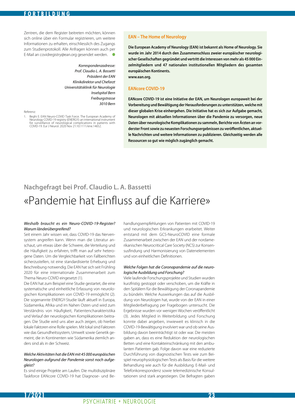 Korrespondenzadresse: Prof. Claudio L. A. Bassetti
