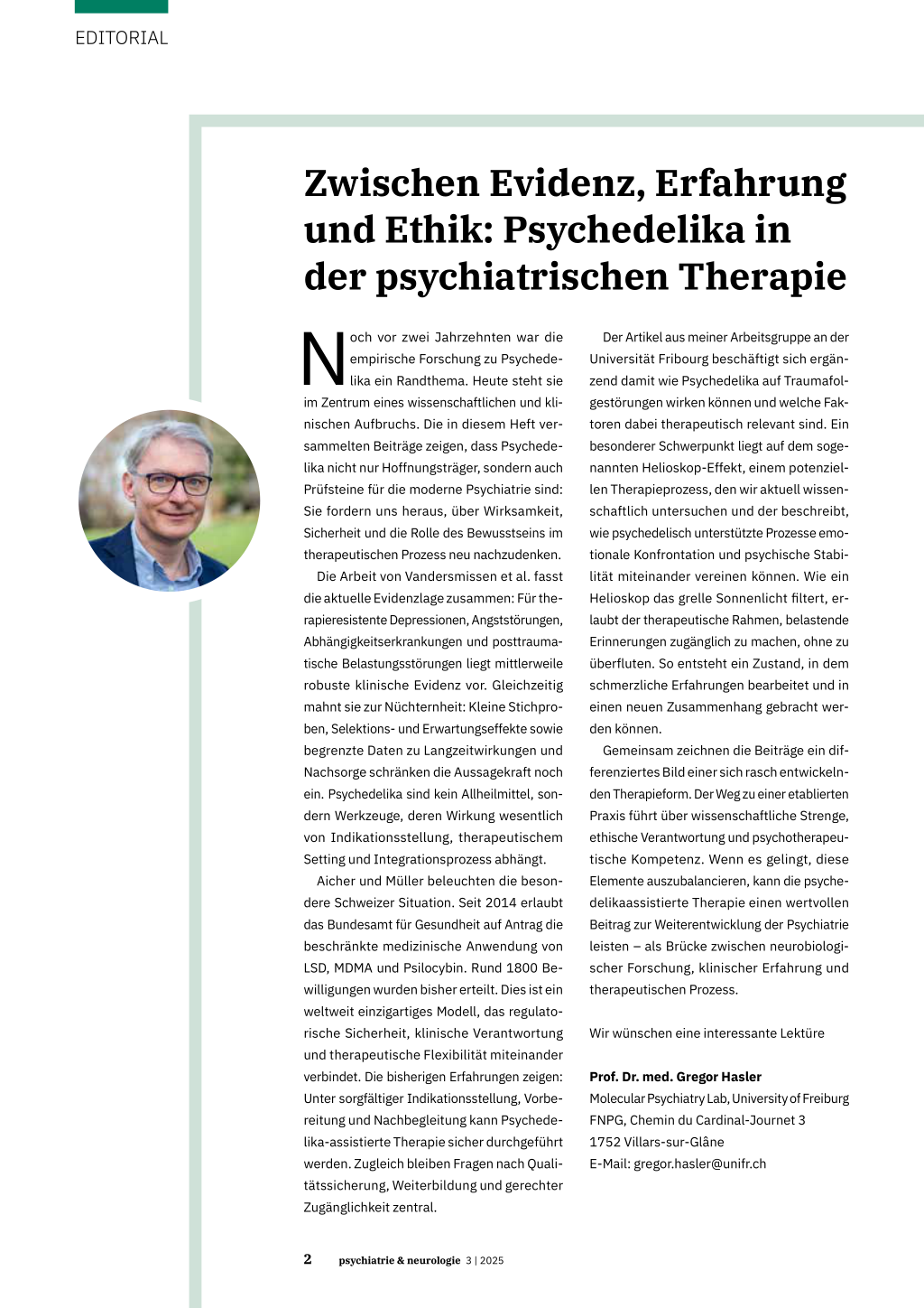 Noch vor zwei Jahrzehnten war die empirische Forschung zu Psychedelika ein Randthema. Heute steht sie im Zentrum eines wissenschaftlichen und klinischen Aufbruchs. Die in diesem Heft versammelten Beiträge zeigen, dass Psychedelika nicht nur Hoffnungsträger, sondern auch Prüfsteine für die moderne Psychiatrie sind: Sie fordern uns heraus, über Wirksamkeit, Sicherheit und die Rolle des Bewusstseins im therapeutischen Prozess neu nachzudenken. Die Arbeit von Vandersmissen et al. fasst die aktuelle Evidenzlage zusammen: Für therapieresistente Depressionen, Angststörungen, Abhängigkeitserkrankungen und posttraumatische Belastungsstörungen liegt mittlerweile robuste klinische Evidenz vor. Gleichzeitig mahnt sie zur Nüchternheit: Kleine Stichproben, Selektions- und Erwartungseffekte sowie begrenzte Daten zu Langzeitwirkungen und Nachsorge schränken die Aussagekraft noch ein. Psychedelika sind kein Allheilmittel, sondern Werkzeuge, deren Wirkung wesentlich von Indikationsstellung, therapeutischem Setting und Integrationsprozess abhängt. Aicher und Müller beleuchten die besondere Schweizer Situation. Seit 2014 erlaubt das Bundesamt für Gesundheit auf Antrag die beschränkte medizinische Anwendung von LSD, MDMA und Psilocybin. Rund 1800 Bewilligungen wurden bisher erteilt. Dies ist ein weltweit einzigartiges Modell, das regulatorische Sicherheit, klinische Verantwortung und therapeutische Flexibilität miteinander verbindet. Die bisherigen Erfahrungen zeigen: Unter sorgfältiger Indikationsstellung, Vorbereitung und Nachbegleitung kann Psychedelika-assistierte Therapie sicher durchgeführt werden. Zugleich bleiben Fragen nach Qualitätssicherung, Weiterbildung und gerechter Zugänglichkeit zentral.