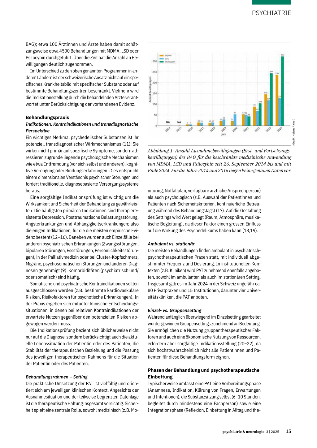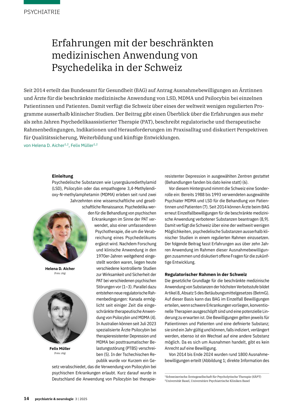 Seit 2014 erteilt das Bundesamt für Gesundheit (BAG) auf Antrag Ausnahmebewilligungen an Ärztinnen und Ärzte für die beschränkte medizinische Anwendung von LSD, MDMA und Psilocybin bei einzelnen Patientinnen und Patienten. Damit verfügt die Schweiz über eines der weltweit wenigen regulierten Programme ausserhalb klinischer Studien. Der Beitrag gibt einen Überblick über die Erfahrungen aus mehr als zehn Jahren Psychedelikaa ssistierter Therapie (PAT), beschreibt regulatorische und therapeutische Rahmenbedingungen, Indikationen und Herausforderungen im Praxisalltag und diskutiert Perspektiven für Qualitätssicherung, Weiterbildung und künftige Entwicklungen. von Helena D. Aicher1,2, Felix Müller1,2
