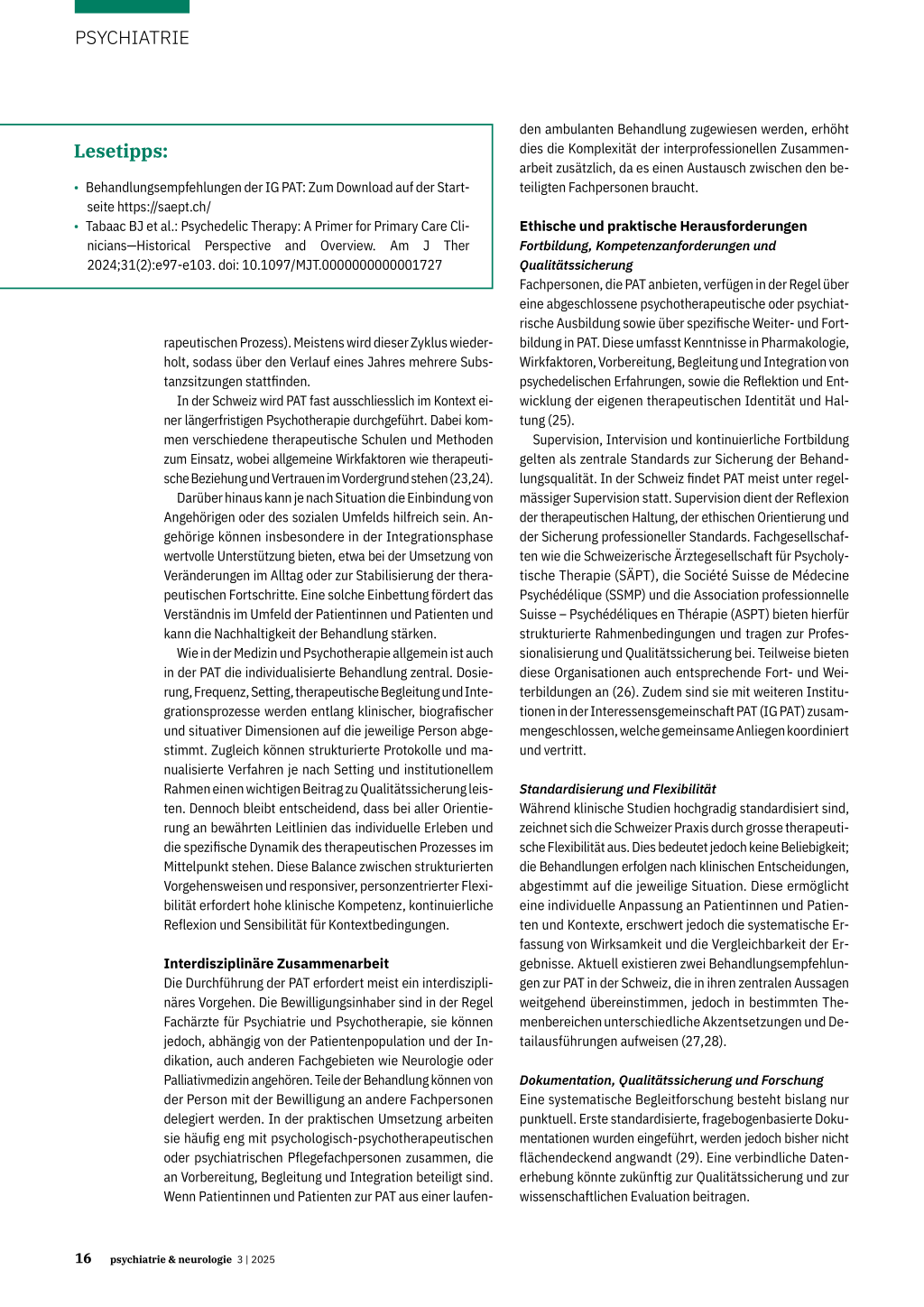 27. Aicher H et al.: Treatment Recommendations for Psychedelic-assisted Therapy. Swiss Arch Neurol Psychiatry Psychother. May 2024; doi:10.4414/sanp.2024.1488043038
