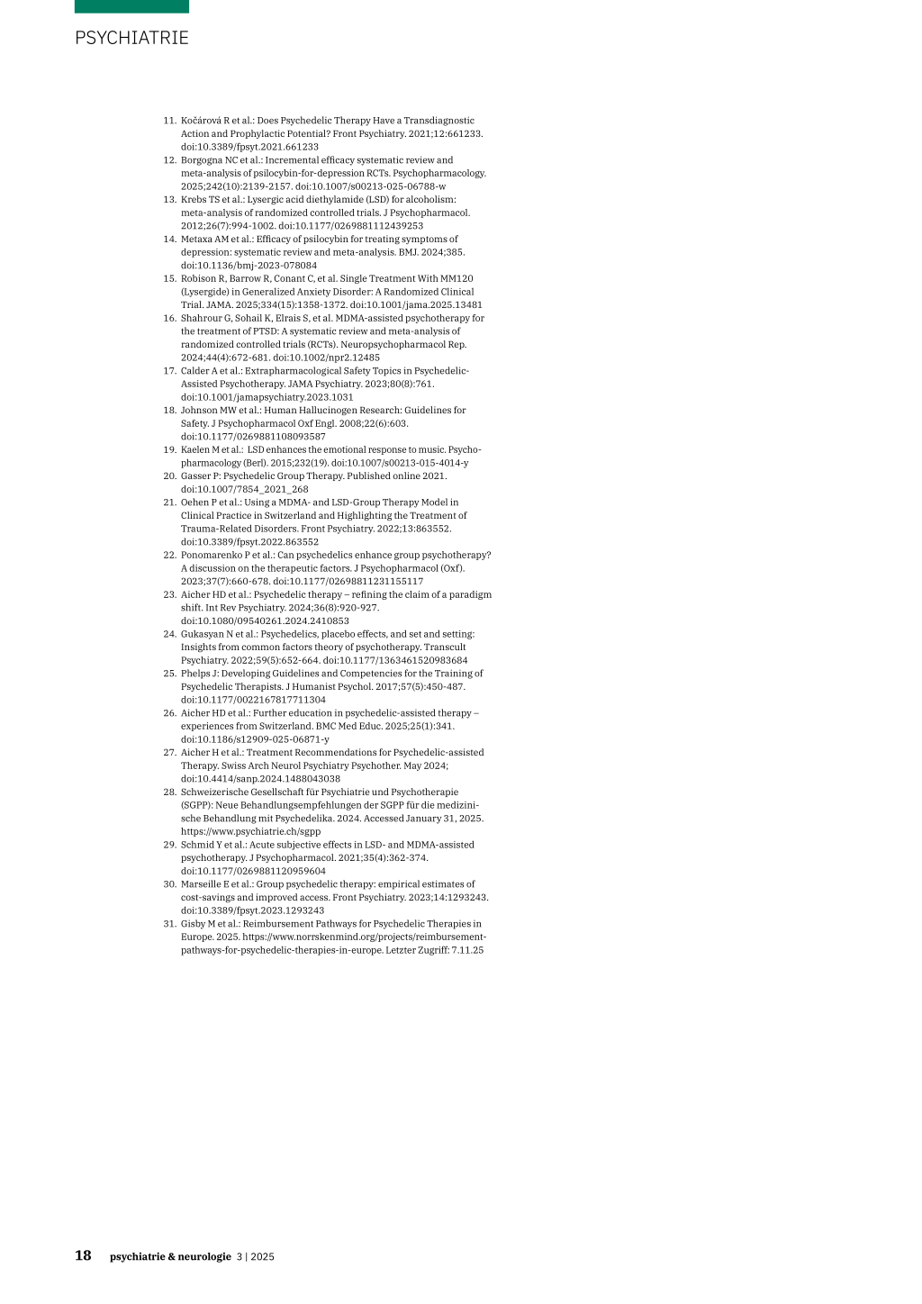 and depressive symptoms: a meta-analysis of mood disorder patients and healthy participants. Psychopharmacology. 2021;238(2):341-354. doi:10.1007/s00213-020-05719-1 2. Ko K et al.: Psychedelic therapy for depressive symptoms: A systematic review and meta-analysis. J Affect Disord. 2023;322:194-204. doi:10.1016/j.jad.2022.09.168 3. Luoma JB et al.: A Meta-Analysis of Placebo-Controlled Trials of Psychedelic-Assisted Therapy. J Psychoactive Drugs. 2020;52(4):289-299. doi:10.1080/02791072.2020.1769878 4. Government of Canada: Notice to stakeholders: Requests to the Special Access Program (SAP) involving psychedelic-assisted psychotherapy. 2023. https://www.canada.ca/en/health-canada/services/drugs-health-products/drug-products/announcements/requests-special-access-programpsychedelic-assisted-psychotherapy.html. Letzter Zugriff: 7.11.25 5. Haridy R: Australia to prescribe MDMA and psilocybin for PTSD and depression in world first. Nature. 2023;619(7969):227-228. doi:10.1038/d41586-023-02093-8 6. Gründer G et al.: Compassionate use of psilocybin for treatment-resistant depression in Germany. Lancet Psychiatry. Published online 2025. doi:10.1016/S2215-0366(25)00277-9 7. Gasser P: Die psycholytische Therapie in der Schweiz von 1988-1993. Schweiz Arch Neurol Psychiatr. 1996;147:59-65. 8. Aicher HD et al.: Psychedelika-assistierte Psychotherapie: Erfahrungen mit der beschränkten medizinischen Anwendung von LSD, MDMA und Psilocybin in der Schweiz. Psychother. 2024;69(2):98-106. doi:10.1007/s00278-024-00711-y 9. Liechti ME et al.: Implementing psychedelic-assisted therapy: History and characteristics of the Swiss limited medical use program. Neurosci Appl. 2025;4:105525. doi:10.1016/j.nsa.2025.105525 10. Liechti M: Experten-Bericht: Stand und Entwicklungsszenarien in Bezug auf die medizinische Behandlung und klinische Forschung mit Halluzinogenen und MDMA.; 2019.