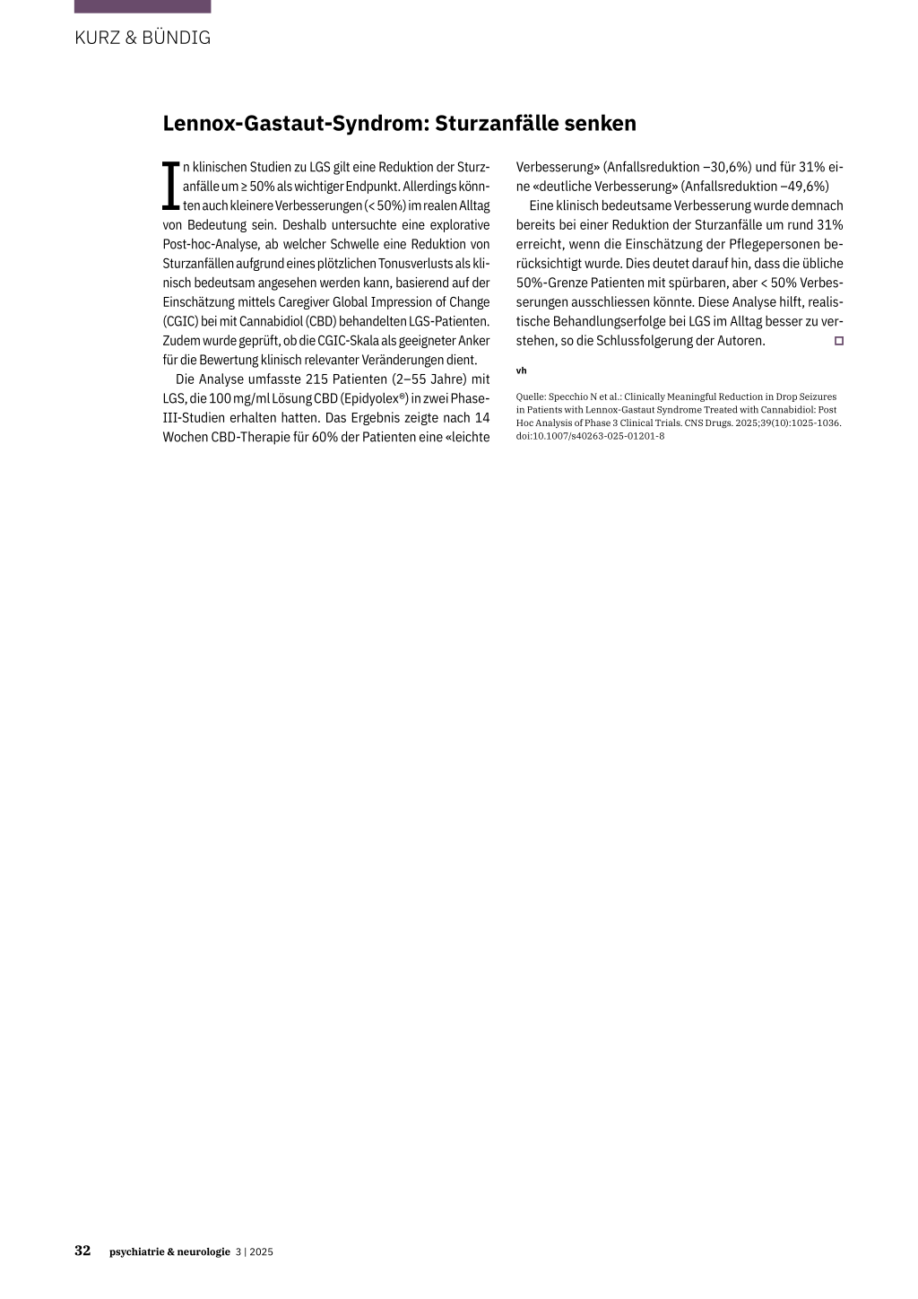 In klinischen Studien zu LGS gilt eine Reduktion der Sturzanfälle um ≥ 50% als wichtiger Endpunkt. Allerdings könnten auch kleinere Verbesserungen (< 50%) im realen Alltag von Bedeutung sein. Deshalb untersuchte eine explorative Post-hoc-Analyse, ab welcher Schwelle eine Reduktion von Sturzanfällen aufgrund eines plötzlichen Tonusverlusts als klinisch bedeutsam angesehen werden kann, basierend auf der Einschätzung mittels Caregiver Global Impression of Change (CGIC) bei mit Cannabidiol (CBD) behandelten LGS-Patienten. Zudem wurde geprüft, ob die CGIC-Skala als geeigneter Anker für die Bewertung klinisch relevanter Veränderungen dient. Die Analyse umfasste 215 Patienten (2–55 Jahre) mit LGS, die 100 mg/ml Lösung CBD (Epidyolex®) in zwei PhaseIII-Studien erhalten hatten. Das Ergebnis zeigte nach 14 Wochen CBD-Therapie für 60% der Patienten eine «leichte Verbesserung» (Anfallsreduktion –30,6%) und für 31% eine «deutliche Verbesserung» (Anfallsreduktion –49,6%) Eine klinisch bedeutsame Verbesserung wurde demnach bereits bei einer Reduktion der Sturzanfälle um rund 31% erreicht, wenn die Einschätzung der Pflegepersonen berücksichtigt wurde. Dies deutet darauf hin, dass die übliche 50%-Grenze Patienten mit spürbaren, aber < 50% Verbesserungen ausschliessen könnte. Diese Analyse hilft, realistische Behandlungserfolge bei LGS im Alltag besser zu verstehen, so die Schlussfolgerung der Autoren. vh Quelle: Specchio N et al.: Clinically Meaningful Reduction in Drop Seizures in Patients with Lennox-Gastaut Syndrome Treated with Cannabidiol: Post Hoc Analysis of Phase 3 Clinical Trials. CNS Drugs. 2025;39(10):1025-1036. doi:10.1007/s40263-025-01201-8 32 psychiatrie & neurologie 3 | 2025