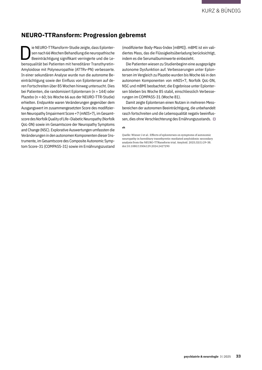 Die NEURO-TTRansform-Studie zeigte, dass Eplontersen nach 66 Wochen Behandlung die neuropathische Beeinträchtigung signifikant verringerte und die Lebensqualität bei Patienten mit hereditärer TransthyretinAmyloidose mit Polyneuropathie (ATTRv-PN) verbesserte. In einer sekundären Analyse wurde nun die autonome Beeinträchtigung sowie der Einfluss von Eplontersen auf deren Fortschreiten über 85 Wochen hinweg untersucht. Dies bei Patienten, die randomisiert Eplontersen (n = 144) oder Plazebo (n = 60; bis Woche 66 aus der NEURO-TTR-Studie) erhielten. Endpunkte waren Veränderungen gegenüber dem Ausgangswert im zusammengesetzten Score des modifizierten Neuropathy Impairment Score +7 (mNIS+7), im Gesamtscore des Norfolk Quality of Life–Diabetic Neuropathy (Norfolk QoL-DN) sowie im Gesamtscore der Neuropathy Symptoms and Change (NSC). Explorative Auswertungen umfassten die Veränderungen in den autonomen Komponenten dieser Instrumente, im Gesamtscore des Composite Autonomic Symptom Score-31 (COMPASS-31) sowie im Ernährungszustand