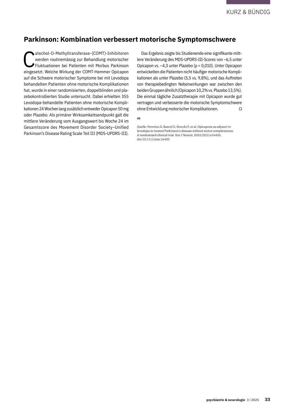 Das Ergebnis zeigte bis Studienende eine signifikante mittlere Veränderung des MDS-UPDRS-III-Scores von –6,5 unter Opicapon vs. –4,3 unter Plazebo (p = 0,010). Unter Opicapon entwickelten die Patienten nicht häufiger motorische Komplikationen als unter Plazebo (5,5 vs. 9,8%), und das Auftreten von therapiebedingten Nebenwirkungen war zwischen den beiden Gruppen ähnlich (Opicapon 10,2% vs. Plazebo 13,5%). Die einmal tägliche Zusatztherapie mit Opicapon wurde gut vertragen und verbesserte die motorische Symptomschwere ohne Entwicklung motorischer Komplikationen.