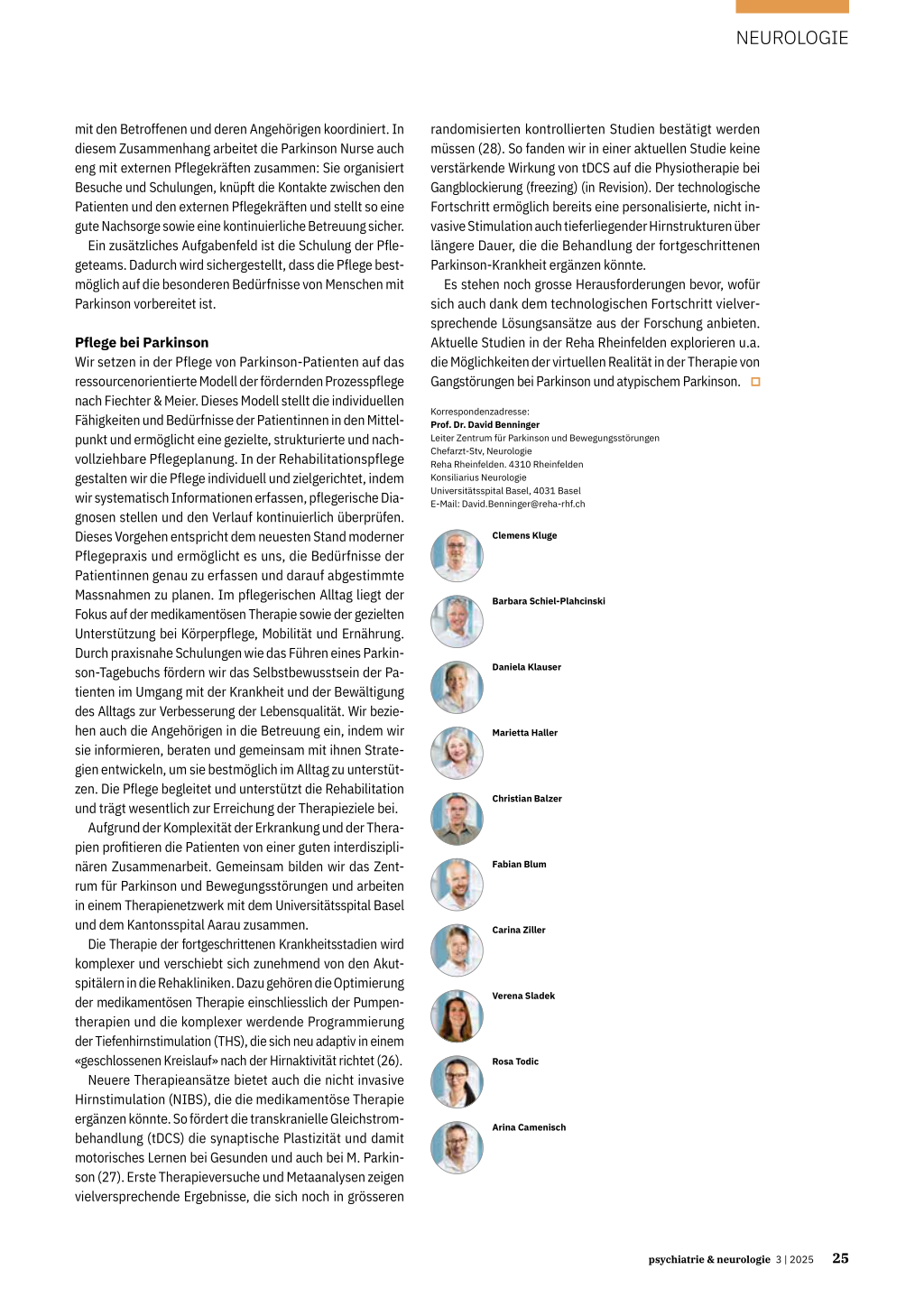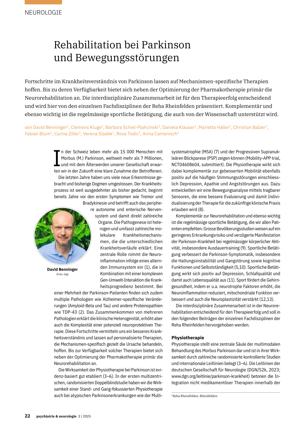 Korrespondenzadresse: Prof. Dr. David Benninger Leiter Zentrum für Parkinson und Bewegungsstörungen Chefarzt-Stv, Neurologie Reha Rheinfelden. 4310 Rheinfelden Konsiliarius Neurologie Universitätsspital Basel, 4031 Basel E-Mail: David.Benninger@reha-rhf.ch