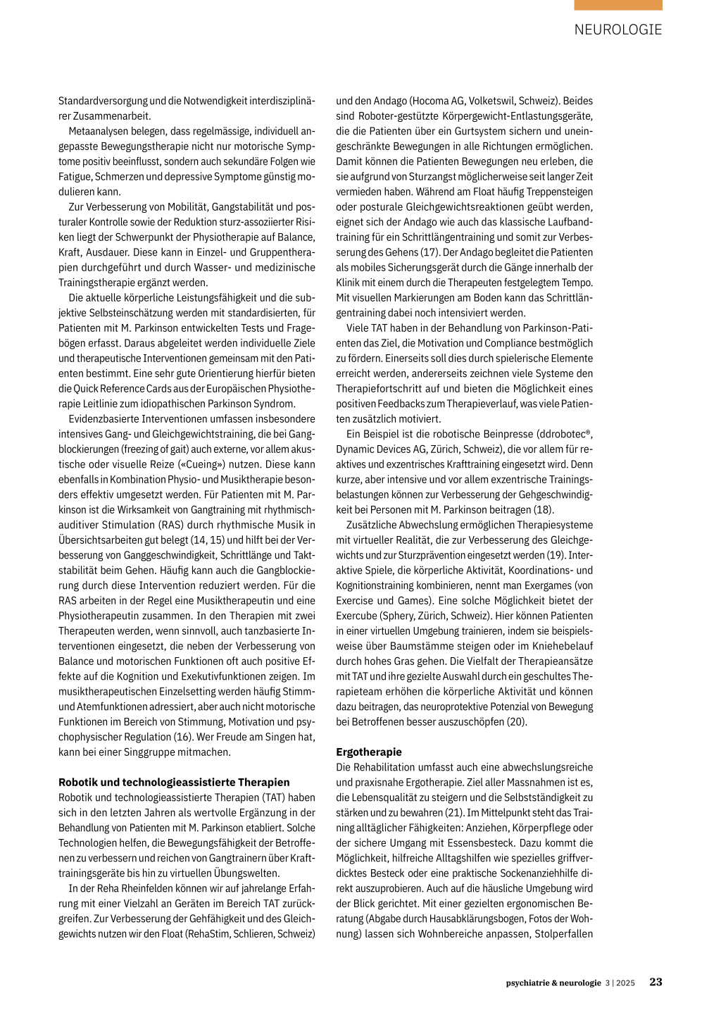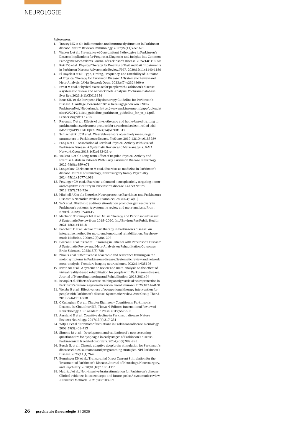 Disease: Implications for Prognosis, Diagnosis, and Insights into Common Pathogenic Mechanisms. Journal of Parkinson’s Disease. 2024;14(1):35-52 3. Rutz DG et al.: Physical Therapy for Freezing of Gait and Gait Impairments in Parkinson Disease: A Systematic Review. PM R. 2020;12(11):1140-1156 4. El Hayek M et al.: Type, Timing, Frequency, and Durability of Outcome of Physical Therapy for Parkinson Disease: A Systematic Review and Meta-Analysis. JAMA Network Open. 2023;6(7):e2324860-e 5. Ernst M et al.: Physical exercise for people with Parkinson's disease: a systematic review and network meta-analysis. Cochrane Database Syst Rev. 2023;1(1):CD013856 6. Keus SHJ et al.: European Physiotherapy Guideline for Parkinson’s Disease. 1. Auflage, Dezember 2014; herausgegeben von KNGF/ ParkinsonNet, Niederlande. https://www.parkinsonnet.nl/app/uploads/ sites/3/2019/11/eu_guideline_parkinson_guideline_for_pt_s1.pdf. Letzter Zugriff: 1.12.25 7. Raccagni C et al.: Effects of physiotherapy and home-based training in parkinsonian syndromes: protocol for a randomised controlled trial (MobilityAPP). BMJ Open. 2024;14(5):e081317 8. Schlachetzki JCM et al.: Wearable sensors objectively measure gait parameters in Parkinson’s disease. PloS one. 2017;12(10):e0183989 9. Fang X et al.: Association of Levels of Physical Activity With Risk of Parkinson Disease: A Systematic Review and Meta-analysis. JAMA Network Open. 2018;1(5):e182421-e 10. Tsukita K et al.: Long-term Effect of Regular Physical Activity and Exercise Habits in Patients With Early Parkinson Disease. Neurology. 2022;98(8):e859-e71 11. Langeskov-Christensen M et al.: Exercise as medicine in Parkinson’s disease. Journal of Neurology, Neurosurgery & Psychiatry. 2024;95(11):1077-1088 12. Petzinger GM et al.: Exercise-enhanced neuroplasticity targeting motor and cognitive circuitry in Parkinson's disease. Lancet Neurol. 2013;12(7):716-726 13. Mitchell AK et al.: Exercise, Neuroprotective Exerkines, and Parkinson's Disease: A Narrative Review. Biomolecules. 2024;14(10) 14. Ye X et al.: Rhythmic auditory stimulation promotes gait recovery in Parkinson's patients: A systematic review and meta-analysis. Front Neurol. 2022;13:940419 15. Machado Sotomayor MJ et al.: Music Therapy and Parkinson’s Disease: A Systematic Review from 2015–2020. Int J Environ Res Public Health. 2021;18(21):11618 16. Pacchetti C et al.: Active music therapy in Parkinson's disease: An integrative method for motor and emotional rehabilitation. Psychosomatic Medicine. 2000;62(3):386-393 17. Boccali E et al.: Treadmill Training in Patients with Parkinson’s Disease: A Systematic Review and Meta-Analysis on Rehabilitation Outcomes. Brain Sciences. 2025;15(8):788 18. Zhou X et al.: Effectiveness of aerobic and resistance training on the motor symptoms in Parkinson's disease: Systematic review and network meta-analysis. Frontiers in aging neuroscience. 2022;14:935176 19. Kwon SH et al.: A systematic review and meta-analysis on the effect of virtual reality-based rehabilitation for people with Parkinson’s disease. Journal of NeuroEngineering and Rehabilitation. 2023;20(1):94 20. Ishaq S et al.: Effects of exercise training on nigrostriatal neuroprotection in Parkinson’s disease: a systematic review. Front Neurosci. 2025;18:1464168 21. Welsby E et al.: Effectiveness of occupational therapy intervention for people with Parkinson’s disease: Systematic review. Aust Occup Ther J. 2019;66(6):731-738 22. O'Callaghan C et al.: Chapter Eighteen – Cognition in Parkinson's Disease. In: Chaudhuri KR, Titova N, Editors. International Review of Neurobiology. 133: Academic Press. 2017;557-583 23. Aarsland D et al.: Cognitive decline in Parkinson disease. Nature Reviews Neurology. 2017;13(4):217-231 24. Witjas T et al.: Nonmotor fluctuations in Parkinson’s disease. Neurology. 2002;59(3):408-413 25. Simons JA et al.: Development and validation of a new screening questionnaire for dysphagia in early stages of Parkinson's disease. Parkinsonism & related disorders. 2014;20(9):992-998 26. Busch JL et al.: Chronic adaptive deep brain stimulation for Parkinson’s disease: clinical outcomes and programming strategies. NPJ Parkinson's Disease. 2025;11(1):264 27. Benninger DH et al.: Transcranial Direct Current Stimulation for the Treatment of Parkinson's Disease. Journal of Neurology, Neurosurgery, and Psychiatry. 2010;81(10):1105-1111 28. Madrid J et al.: Non-invasive brain stimulation for Parkinson's disease: Clinical evidence, latest concepts and future goals: A systematic review. J Neurosci Methods. 2021;347:108957