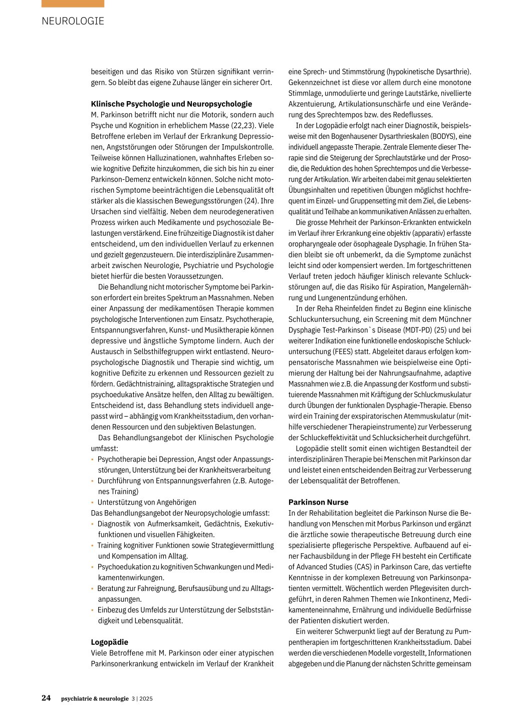 Klinische Psychologie und Neuropsychologie M. Parkinson betrifft nicht nur die Motorik, sondern auch Psyche und Kognition in erheblichem Masse (22,23). Viele Betroffene erleben im Verlauf der Erkrankung Depressionen, Angststörungen oder Störungen der Impulskontrolle. Teilweise können Halluzinationen, wahnhaftes Erleben sowie kognitive Defizite hinzukommen, die sich bis hin zu einer Parkinson-Demenz entwickeln können. Solche nicht motorischen Symptome beeinträchtigen die Lebensqualität oft stärker als die klassischen Bewegungsstörungen (24). Ihre Ursachen sind vielfältig. Neben dem neurodegenerativen Prozess wirken auch Medikamente und psychosoziale Belastungen verstärkend. Eine frühzeitige Diagnostik ist daher entscheidend, um den individuellen Verlauf zu erkennen und gezielt gegenzusteuern. Die interdisziplinäre Zusammenarbeit zwischen Neurologie, Psychiatrie und Psychologie bietet hierfür die besten Voraussetzungen.