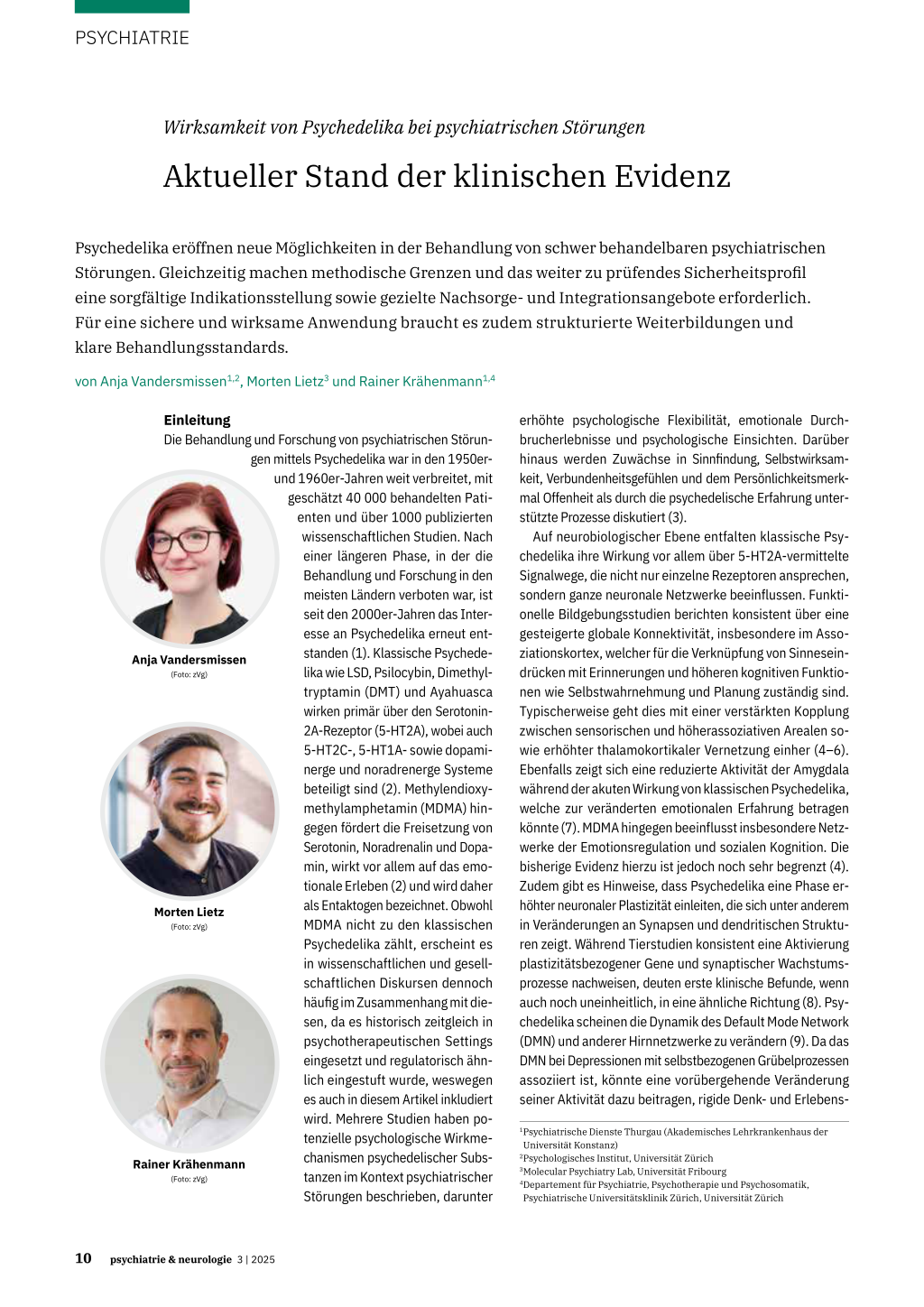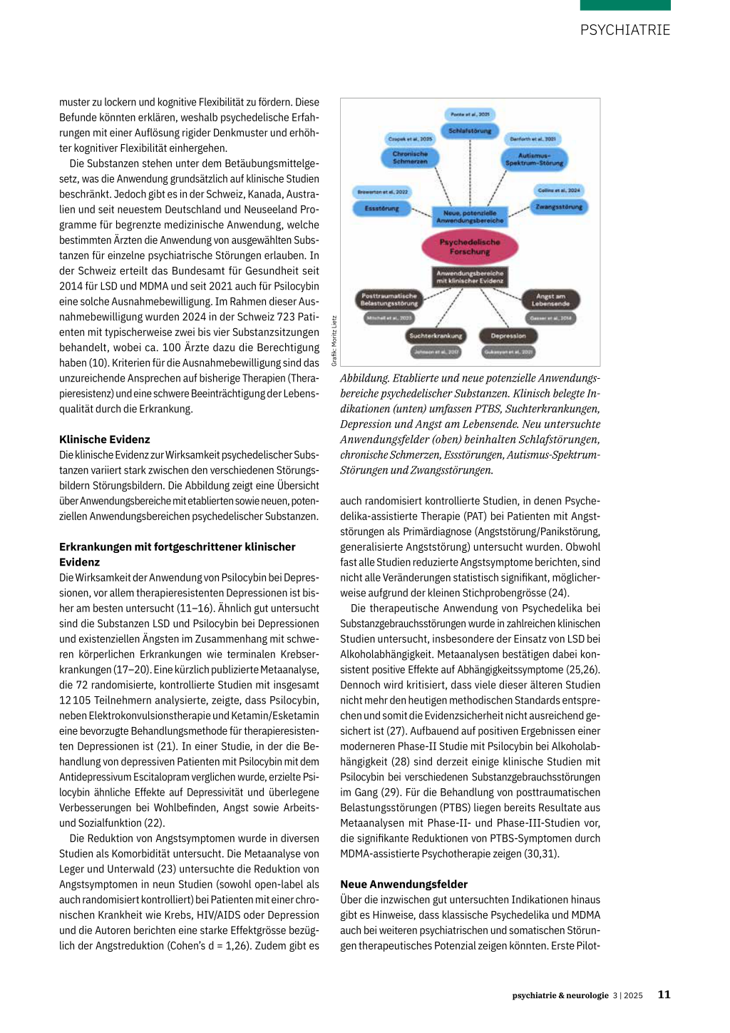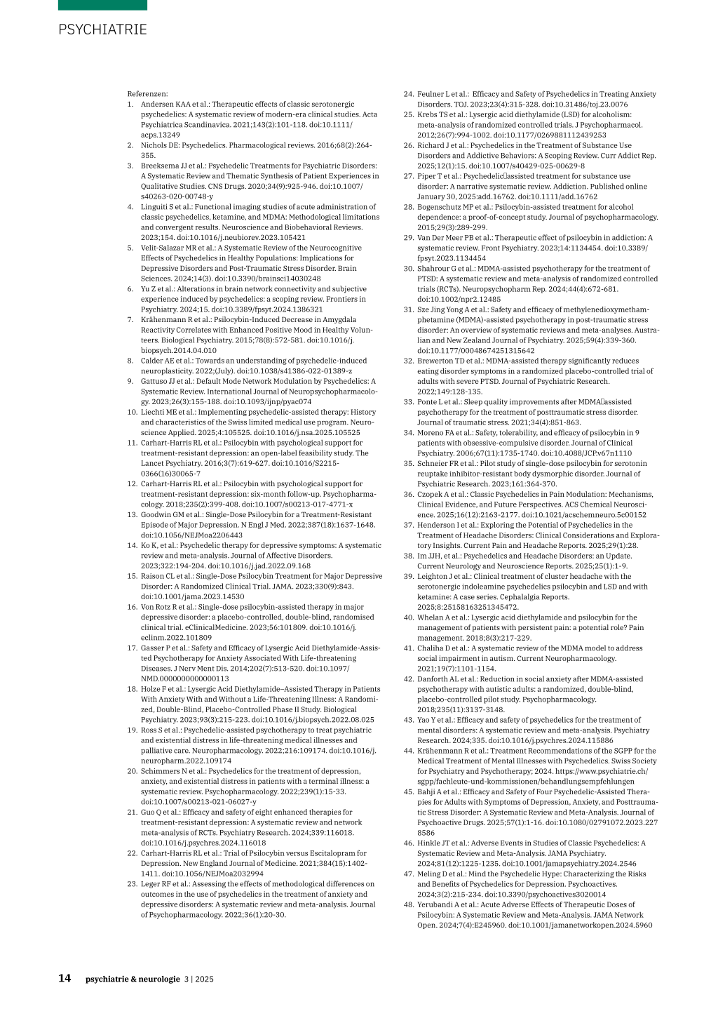psychedelics: A systematic review of modern-era clinical studies. Acta Psychiatrica Scandinavica. 2021;143(2):101-118. doi:10.1111/ acps.13249 2. Nichols DE: Psychedelics. Pharmacological reviews. 2016;68(2):264355. 3. Breeksema JJ et al.: Psychedelic Treatments for Psychiatric Disorders: A Systematic Review and Thematic Synthesis of Patient Experiences in Qualitative Studies. CNS Drugs. 2020;34(9):925-946. doi:10.1007/ s40263-020-00748-y 4. Linguiti S et al.: Functional imaging studies of acute administration of classic psychedelics, ketamine, and MDMA: Methodological limitations and convergent results. Neuroscience and Biobehavioral Reviews. 2023;154. doi:10.1016/j.neubiorev.2023.105421 5. Velit-Salazar MR et al.: A Systematic Review of the Neurocognitive Effects of Psychedelics in Healthy Populations: Implications for Depressive Disorders and Post-Traumatic Stress Disorder. Brain Sciences. 2024;14(3). doi:10.3390/brainsci14030248 6. Yu Z et al.: Alterations in brain network connectivity and subjective experience induced by psychedelics: a scoping review. Frontiers in Psychiatry. 2024;15. doi:10.3389/fpsyt.2024.1386321 7. Krähenmann R et al.: Psilocybin-Induced Decrease in Amygdala Reactivity Correlates with Enhanced Positive Mood in Healthy Volunteers. Biological Psychiatry. 2015;78(8):572-581. doi:10.1016/j. biopsych.2014.04.010 8. Calder AE et al.: Towards an understanding of psychedelic-induced neuroplasticity. 2022;(July). doi:10.1038/s41386-022-01389-z 9. Gattuso JJ et al.: Default Mode Network Modulation by Psychedelics: A Systematic Review. International Journal of Neuropsychopharmacology. 2023;26(3):155-188. doi:10.1093/ijnp/pyac074 10. Liechti ME et al.: Implementing psychedelic-assisted therapy: History and characteristics of the Swiss limited medical use program. Neuroscience Applied. 2025;4:105525. doi:10.1016/j.nsa.2025.105525 11. Carhart-Harris RL et al.: Psilocybin with psychological support for treatment-resistant depression: an open-label feasibility study. The Lancet Psychiatry. 2016;3(7):619-627. doi:10.1016/S22150366(16)30065-7 12. Carhart-Harris RL et al.: Psilocybin with psychological support for treatment-resistant depression: six-month follow-up. Psychopharmacology. 2018;235(2):399-408. doi:10.1007/s00213-017-4771-x 13. Goodwin GM et al.: Single-Dose Psilocybin for a Treatment-Resistant Episode of Major Depression. N Engl J Med. 2022;387(18):1637-1648. doi:10.1056/NEJMoa2206443 14. Ko K, et al.: Psychedelic therapy for depressive symptoms: A systematic review and meta-analysis. Journal of Affective Disorders. 2023;322:194-204. doi:10.1016/j.jad.2022.09.168 15. Raison CL et al.: Single-Dose Psilocybin Treatment for Major Depressive Disorder: A Randomized Clinical Trial. JAMA. 2023;330(9):843. doi:10.1001/jama.2023.14530 16. Von Rotz R et al.: Single-dose psilocybin-assisted therapy in major depressive disorder: a placebo-controlled, double-blind, randomised clinical trial. eClinicalMedicine. 2023;56:101809. doi:10.1016/j. eclinm.2022.101809 17. Gasser P et al.: Safety and Efficacy of Lysergic Acid Diethylamide-Assisted Psychotherapy for Anxiety Associated With Life-threatening Diseases. J Nerv Ment Dis. 2014;202(7):513-520. doi:10.1097/ NMD.0000000000000113 18. Holze F et al.: Lysergic Acid Diethylamide–Assisted Therapy in Patients With Anxiety With and Without a Life-Threatening Illness: A Randomized, Double-Blind, Placebo-Controlled Phase II Study. Biological Psychiatry. 2023;93(3):215-223. doi:10.1016/j.biopsych.2022.08.025 19. Ross S et al.: Psychedelic-assisted psychotherapy to treat psychiatric and existential distress in life-threatening medical illnesses and palliative care. Neuropharmacology. 2022;216:109174. doi:10.1016/j. neuropharm.2022.109174 20. Schimmers N et al.: Psychedelics for the treatment of depression, anxiety, and existential distress in patients with a terminal illness: a systematic review. Psychopharmacology. 2022;239(1):15-33. doi:10.1007/s00213-021-06027-y 21. Guo Q et al.: Efficacy and safety of eight enhanced therapies for treatment-resistant depression: A systematic review and network meta-analysis of RCTs. Psychiatry Research. 2024;339:116018. doi:10.1016/j.psychres.2024.116018 22. Carhart-Harris RL et al.: Trial of Psilocybin versus Escitalopram for Depression. New England Journal of Medicine. 2021;384(15):14021411. doi:10.1056/NEJMoa2032994 23. Leger RF et al.: Assessing the effects of methodological differences on outcomes in the use of psychedelics in the treatment of anxiety and depressive disorders: A systematic review and meta-analysis. Journal of Psychopharmacology. 2022;36(1):20-30.