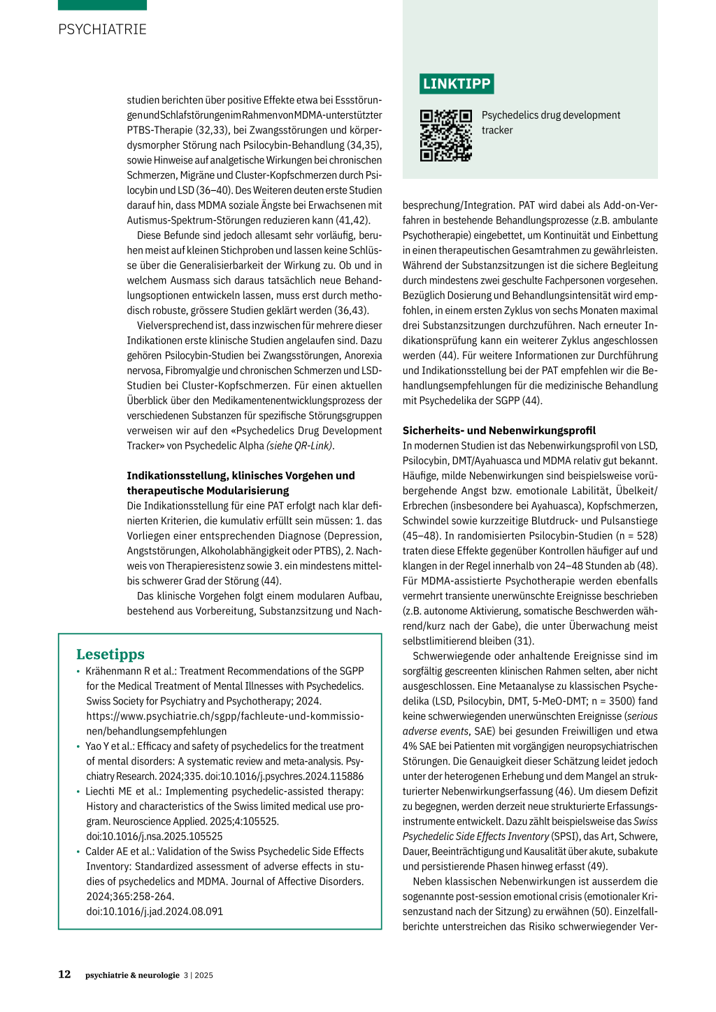 44. Krähenmann R et al.: Treatment Recommendations of the SGPP for the Medical Treatment of Mental Illnesses with Psychedelics. Swiss Society for Psychiatry and Psychotherapy; 2024. https://www.psychiatrie.ch/ sgpp/fachleute-und-kommissionen/behandlungsempfehlungen