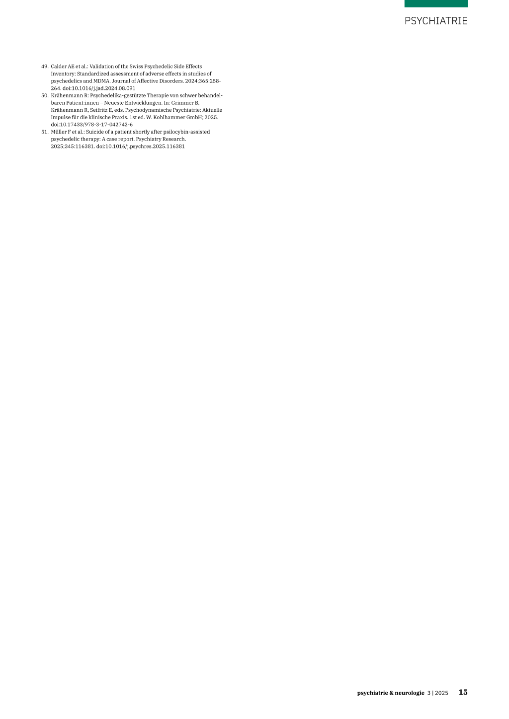 51. Müller F et al.: Suicide of a patient shortly after psilocybin-assisted psychedelic therapy: A case report. Psychiatry Research. 2025;345:116381. doi:10.1016/j.psychres.2025.116381