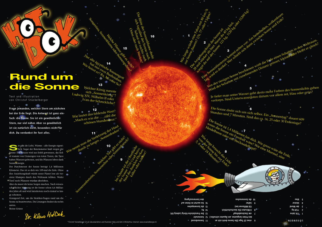Sie gibt dir Licht, Wärme – alle Energie eigentlich. Sogar der Benzinmotor läuft wegen der Sonne: Das Benzin wird aus Erdöl gewonnen, das Erdöl stammt von Unmengen von toten Tieren, die Tiere haben Pflanzen gefressen, und die Pflanzen leben dank Sonnenenergie. Der Durchmesser der Sonne beträgt 1,4 Millionen Kilometer. Das ist so dick wie 109-mal die Erde. Ohne ihre Anziehungskraft würde unser Planet lose als vereister Klumpen durch den Weltraum treiben. Weder Tiere noch Pflanzen würden überleben. Aber du musst dir keine Sorgen machen. Nach wissenschaftlicher Meinung ist die Sonne schon 4,6 Milliarden Jahre alt und wird mindestens noch einmal so lange scheinen. Genügend Zeit, um die Strahlen-Fragen rund um die Sonne zu beantworten. Die Lösungen findest du rechts unten. Heisse Grüsse